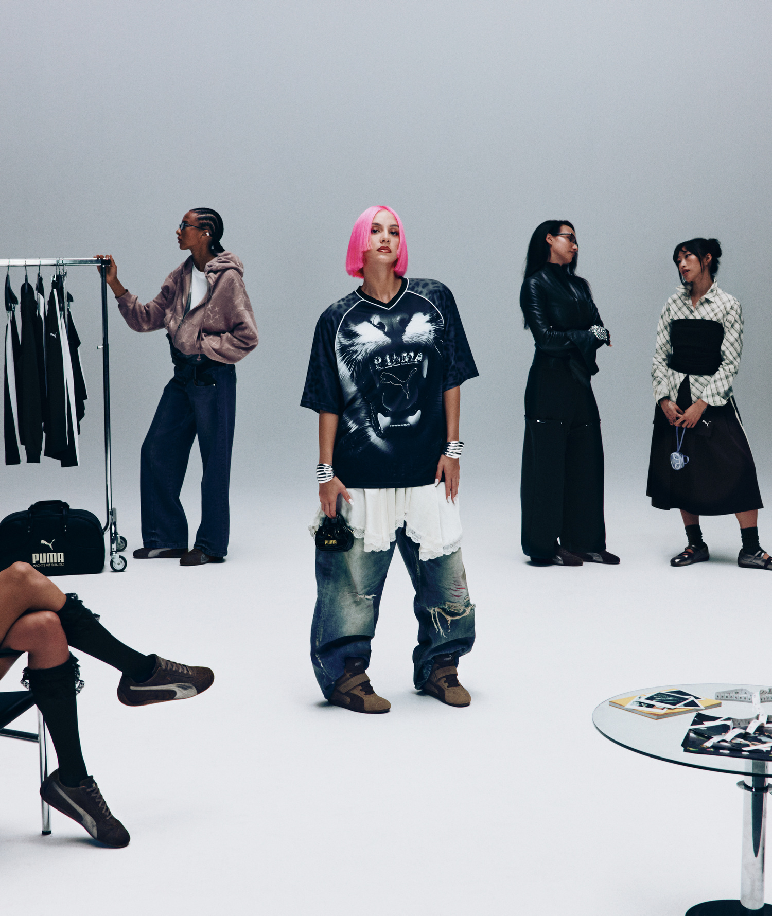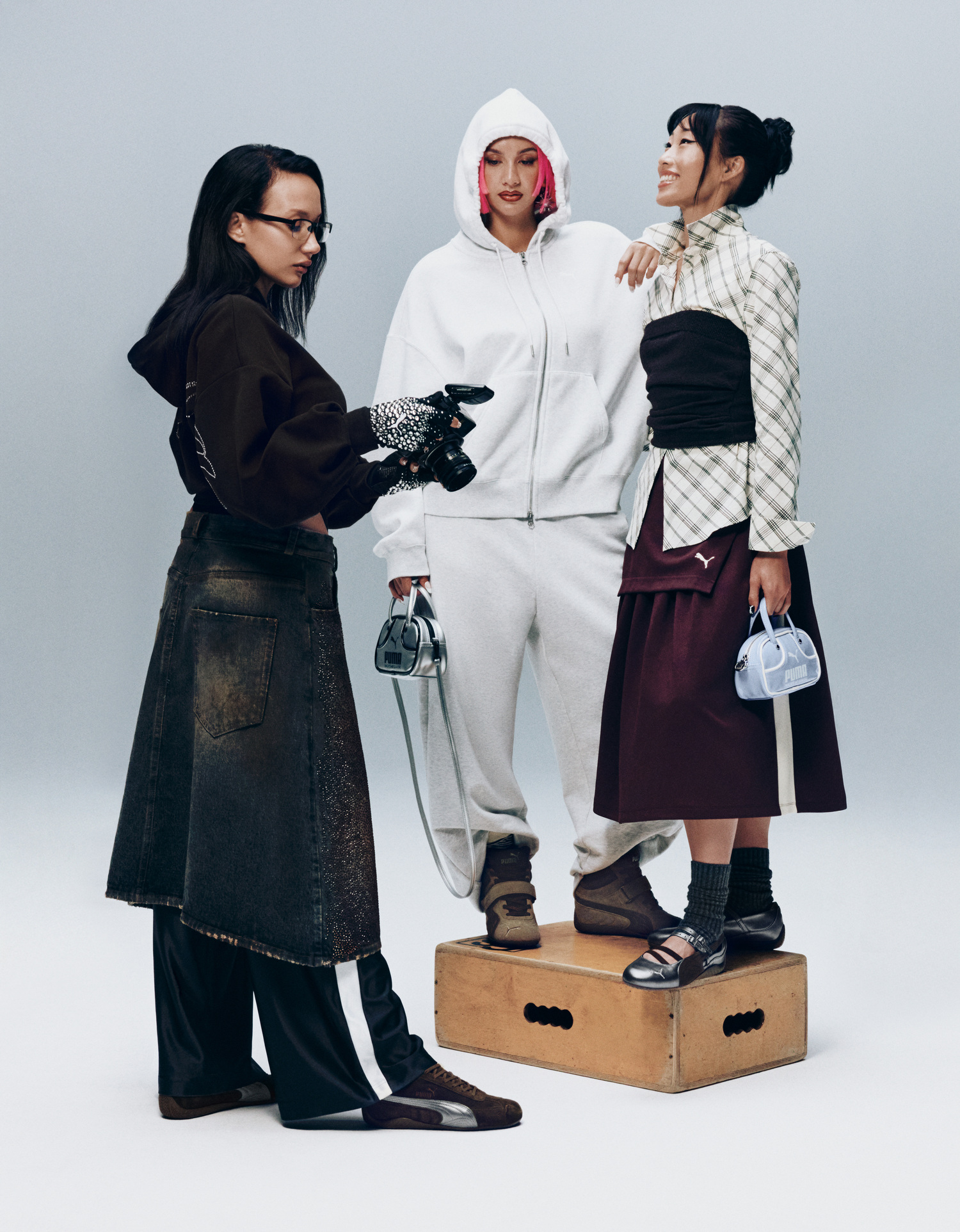With this campaign, PUMA also opens a new chapter: the revival of the Speedcat Wedge, reintroduced with a concealed heel that shifts the proportions of the original icon. Alongside it stands the new Speedcat Ballet, inspired by the elegance of classic ballet flats, and the Speedcat OG, which stays true to the shape and spirit of the 1999 original. The trio is unified through a brown suede treatment, contrasted with metallic grey accents.