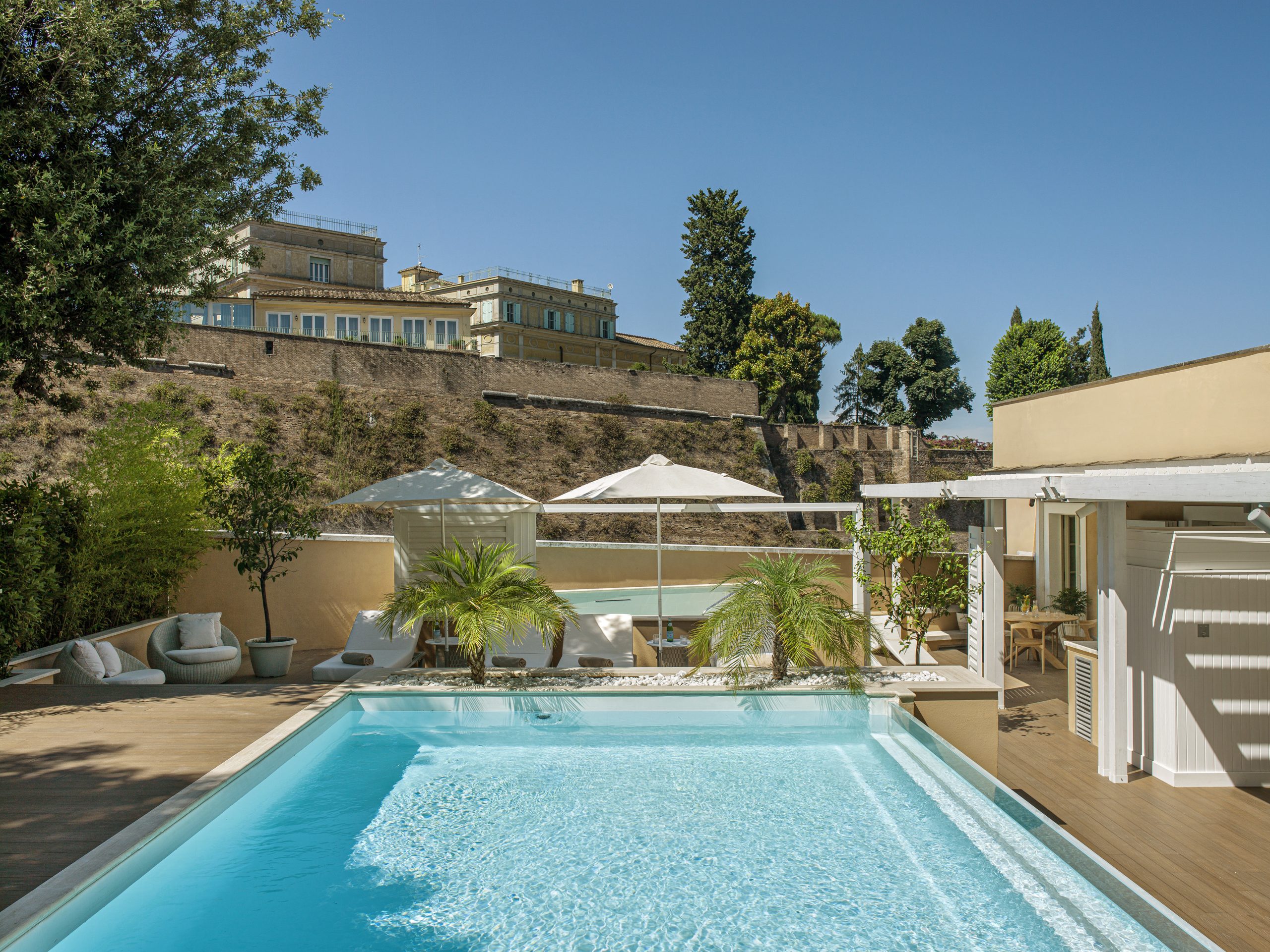 A sense of history can be seen and felt throughout the hotel’s design with rooms and suites featuring Roman mural walls, classic furnishings and some with private terraces overlooking the property’s gardens.