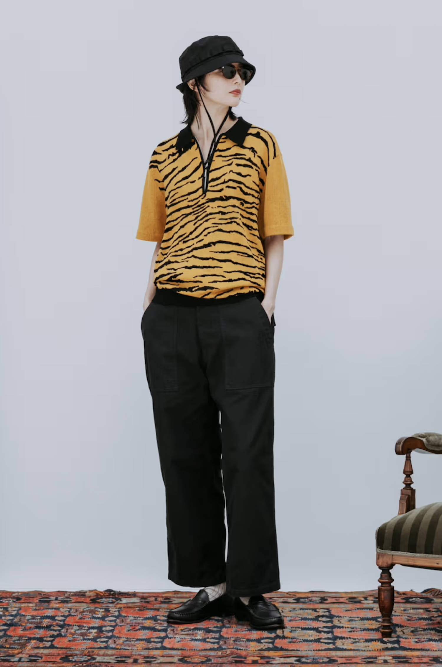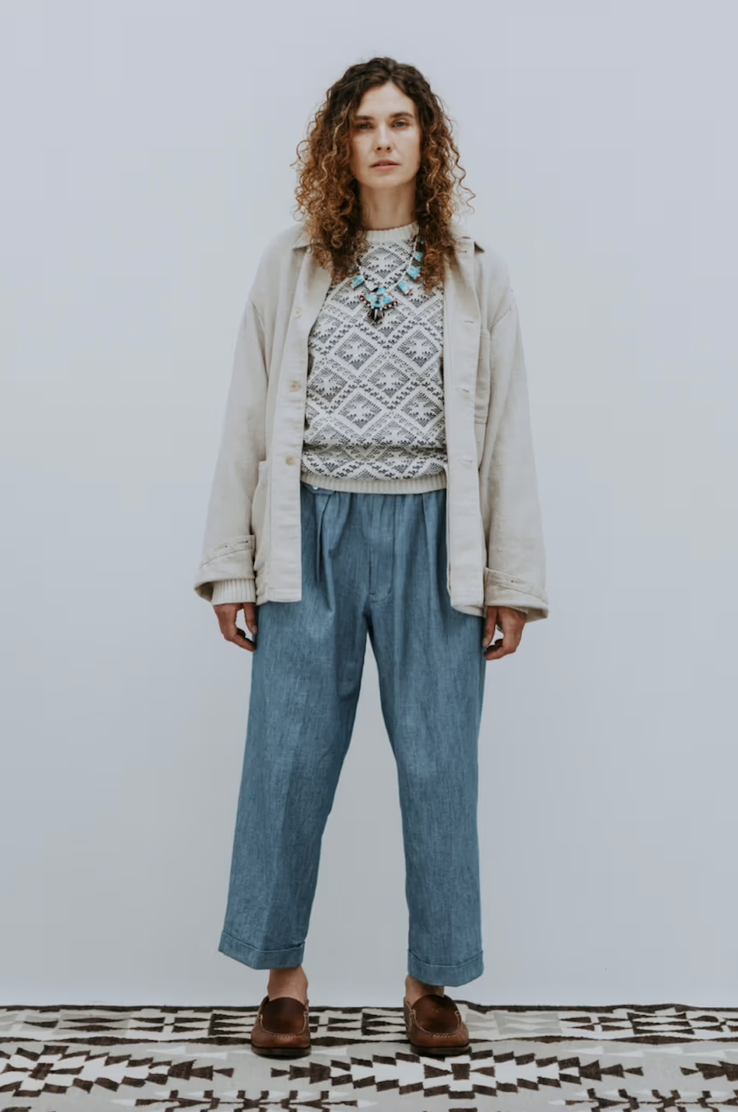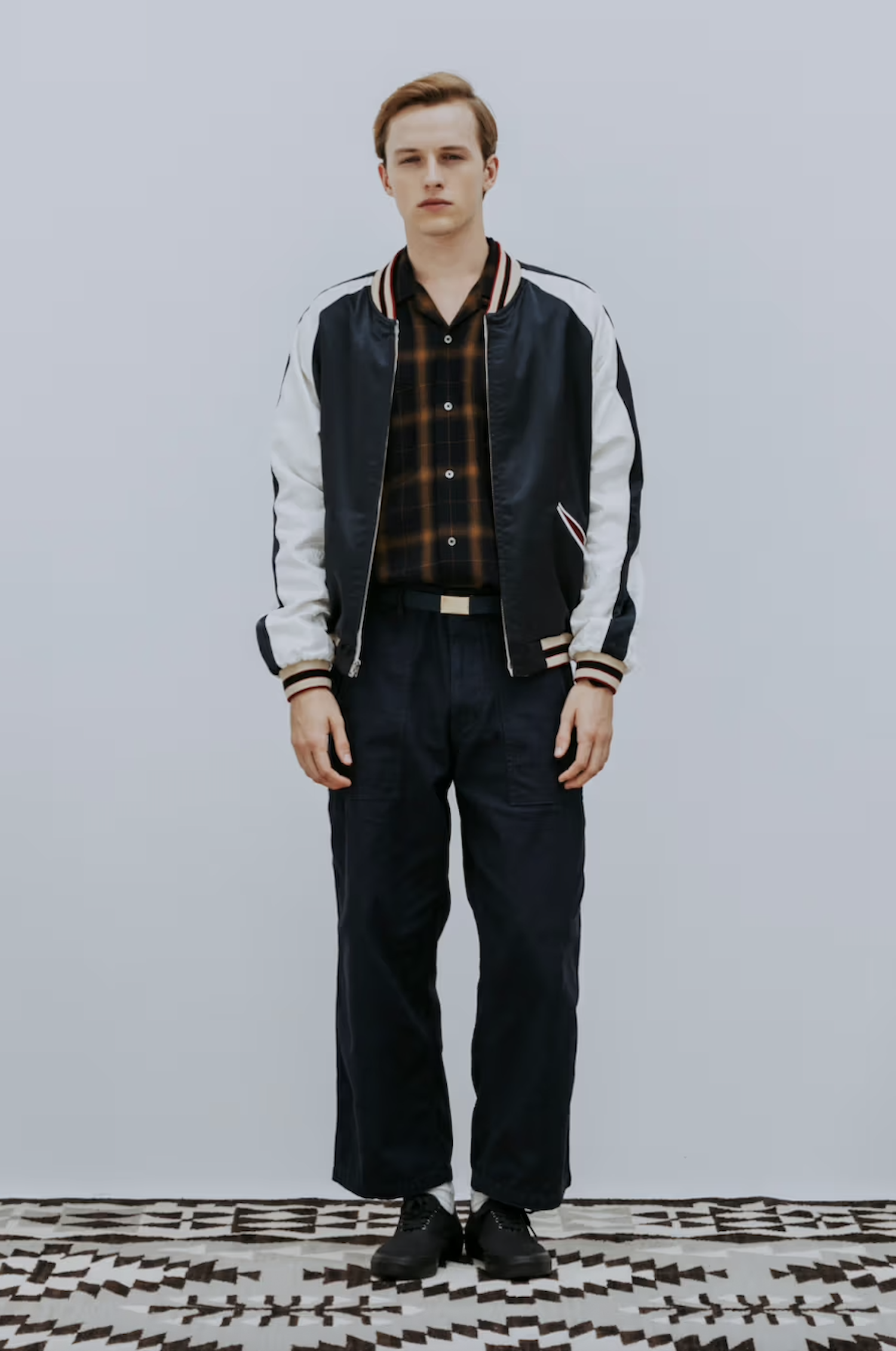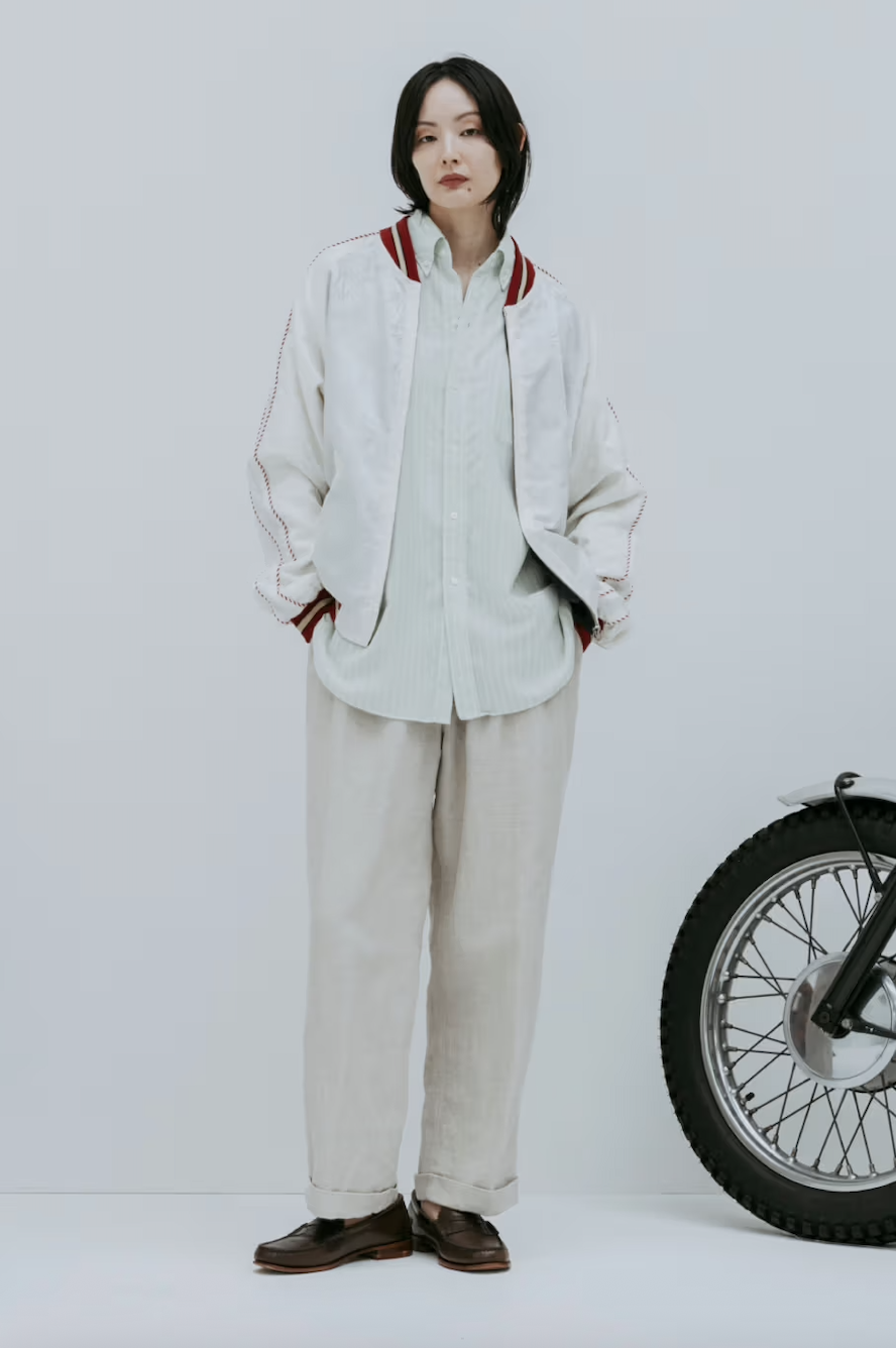 Standout pieces within the collection include triacetate souvenir jackets featuring Yonezawa-ori jacquard patterns, alongside pigment-dyed jackets designed to evoke the worn-in charm of 1950s vintage outerwear. Together, they create a wardrobe that feels both nostalgic and practical for modern wear.