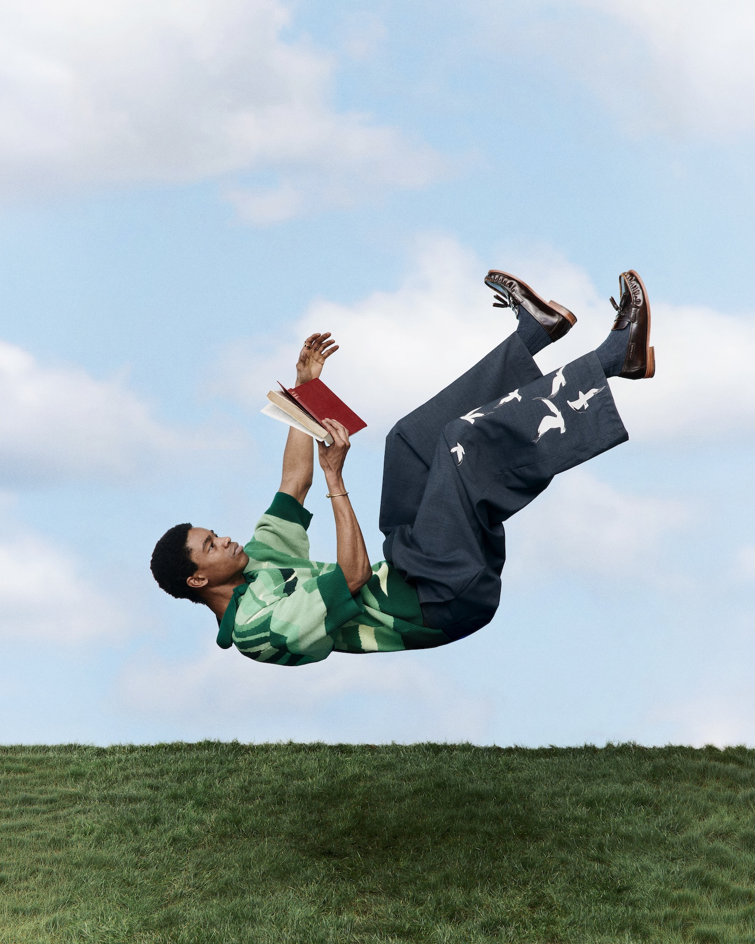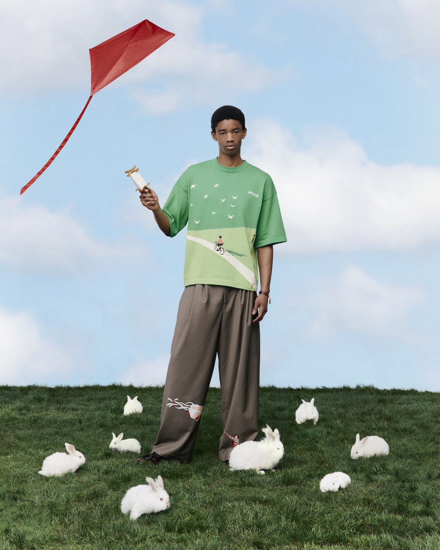 Grounded in earthy greens and browns, the offering is completed with statement trousers featuring kite motifs, flocks of birds, and alpine references, situating the Lauterbrun collection firmly within the House of Errors universe.