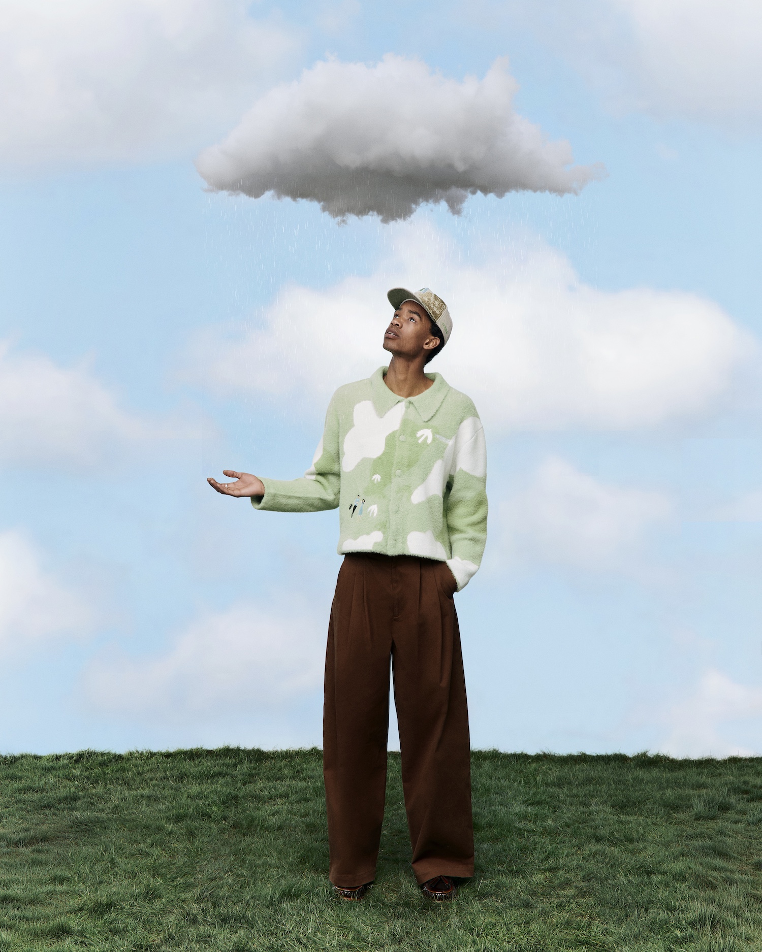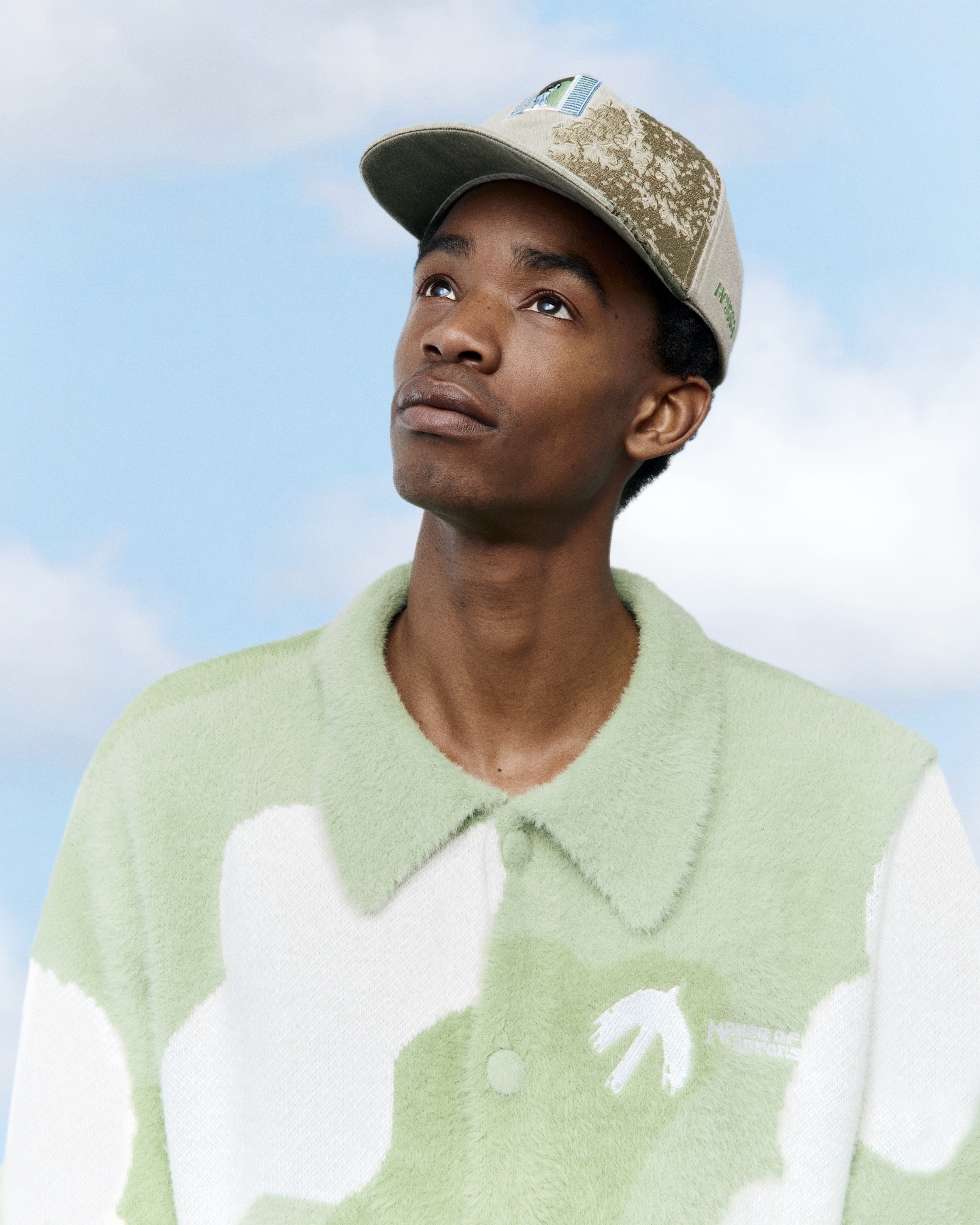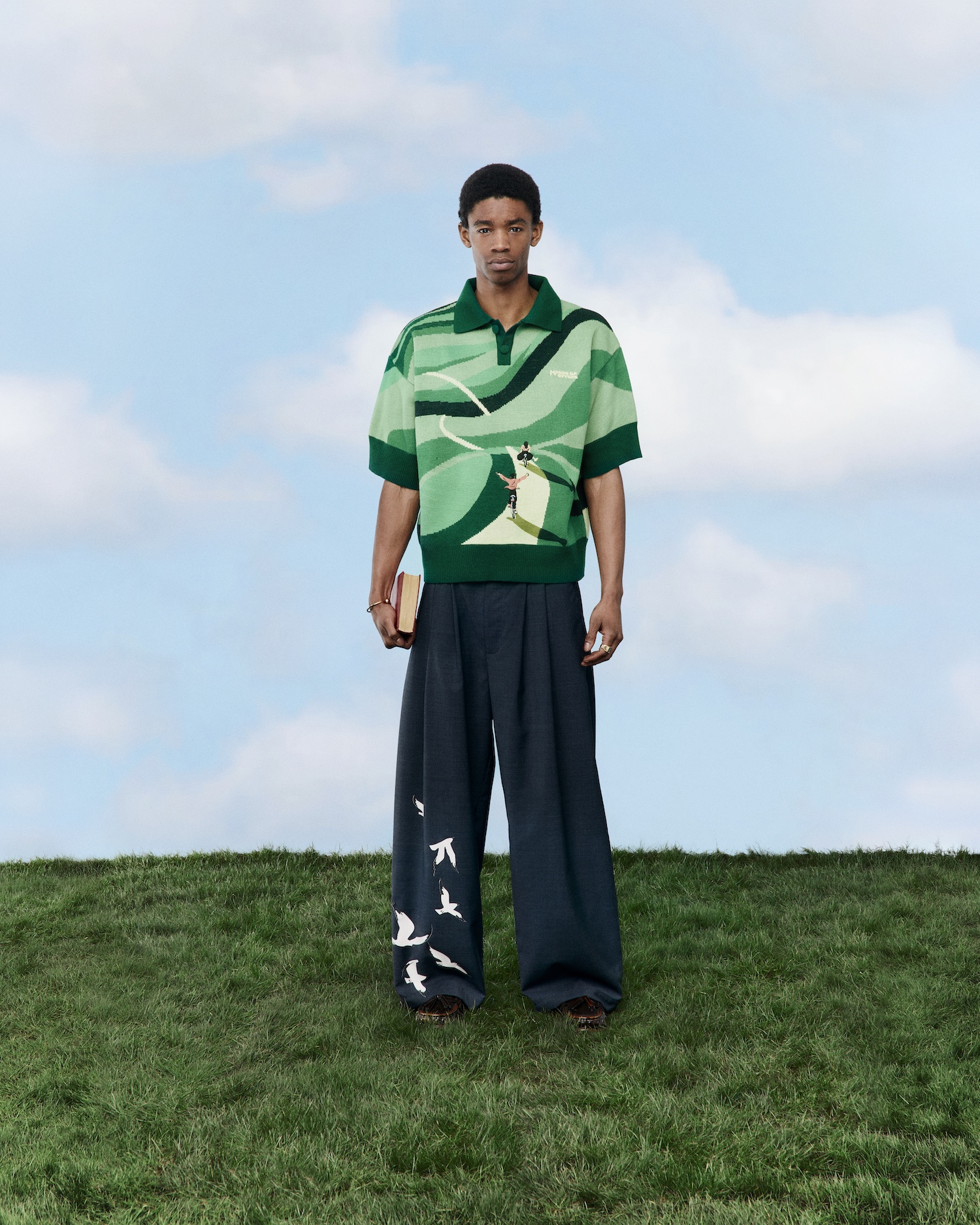Drawing from moments of escape and togetherness – cycling through hills, carving snowy slopes, or finding calm on open grass – the London-based label channels playful exploration into its distinctive visual language. The capsule spans knitwear, embroidery, denim, and detailed finishes, including a knitted polo and T-shirt illustrating a couple riding through rolling landscapes, alongside pieces capturing the stillness after adventure.