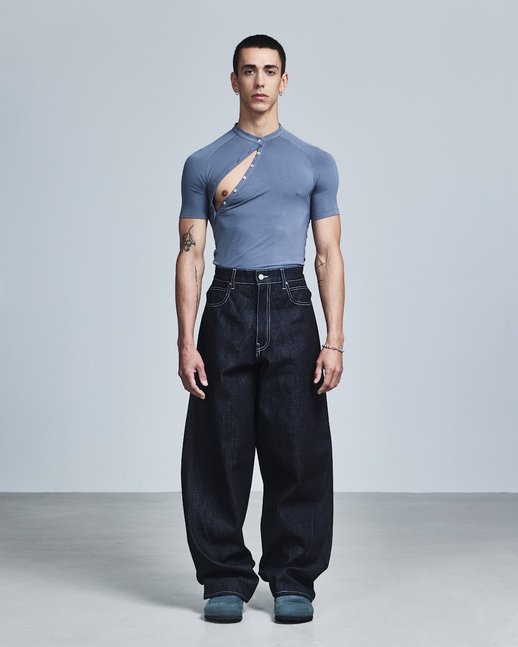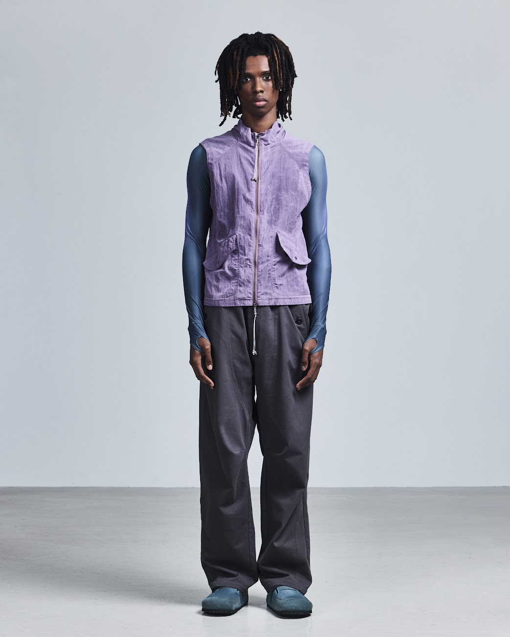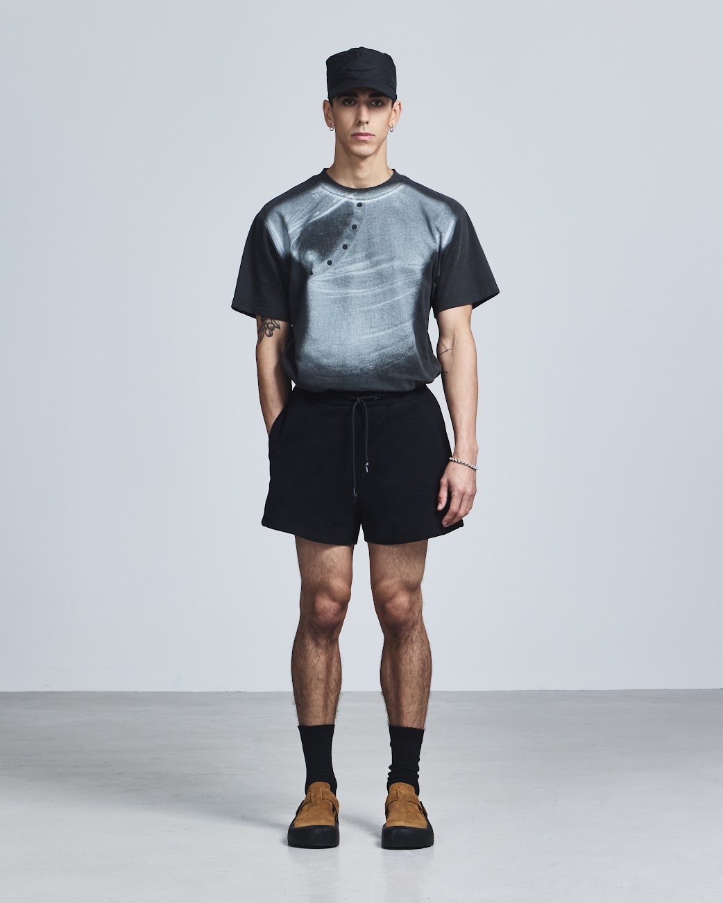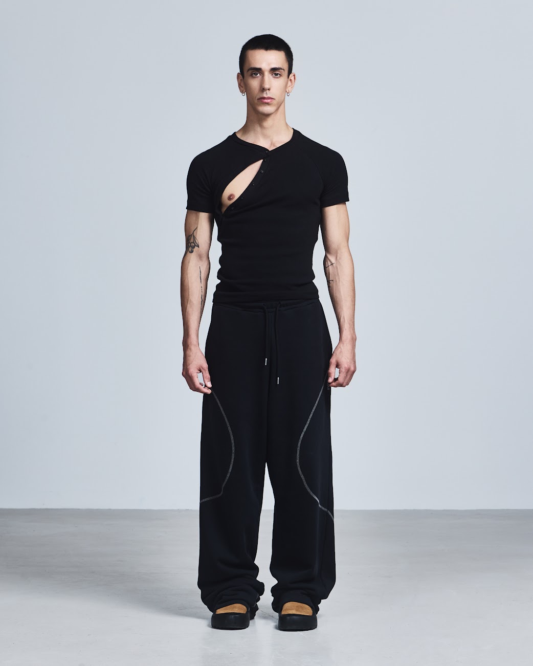For SS26, he leans fully into the power of touch with EMBRACE, a collection rooted in intimacy, gesture, and physical connection. Movement remains central, but it’s softened by a spiritual, subtly hedonistic energy: stretch Henleys cling to the body with asymmetric fastenings that can be undone to reveal skin, compression tops carry a handprint stretched across the chest, and heavyweight ISKO denim is laser-engraved with hazy images of intertwined bodies. Signature kinetic-cut flight jackets, tracksuits, and sport vests return alongside expanded tailoring, including hooded Oxford shirts in water-resistant poplin plaids. Rendered in muted greys, pale yellows, and soft purples, EMBRACE blurs structure and softness, utility and desire. Part one lands January 14, 2026, with further drops arriving throughout the season.