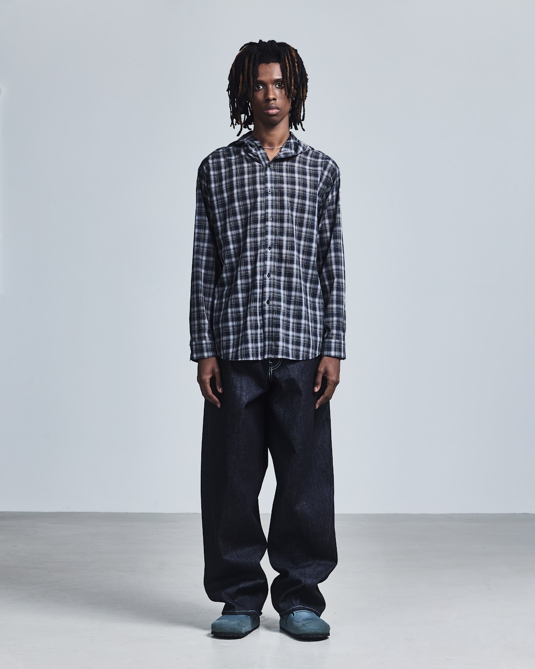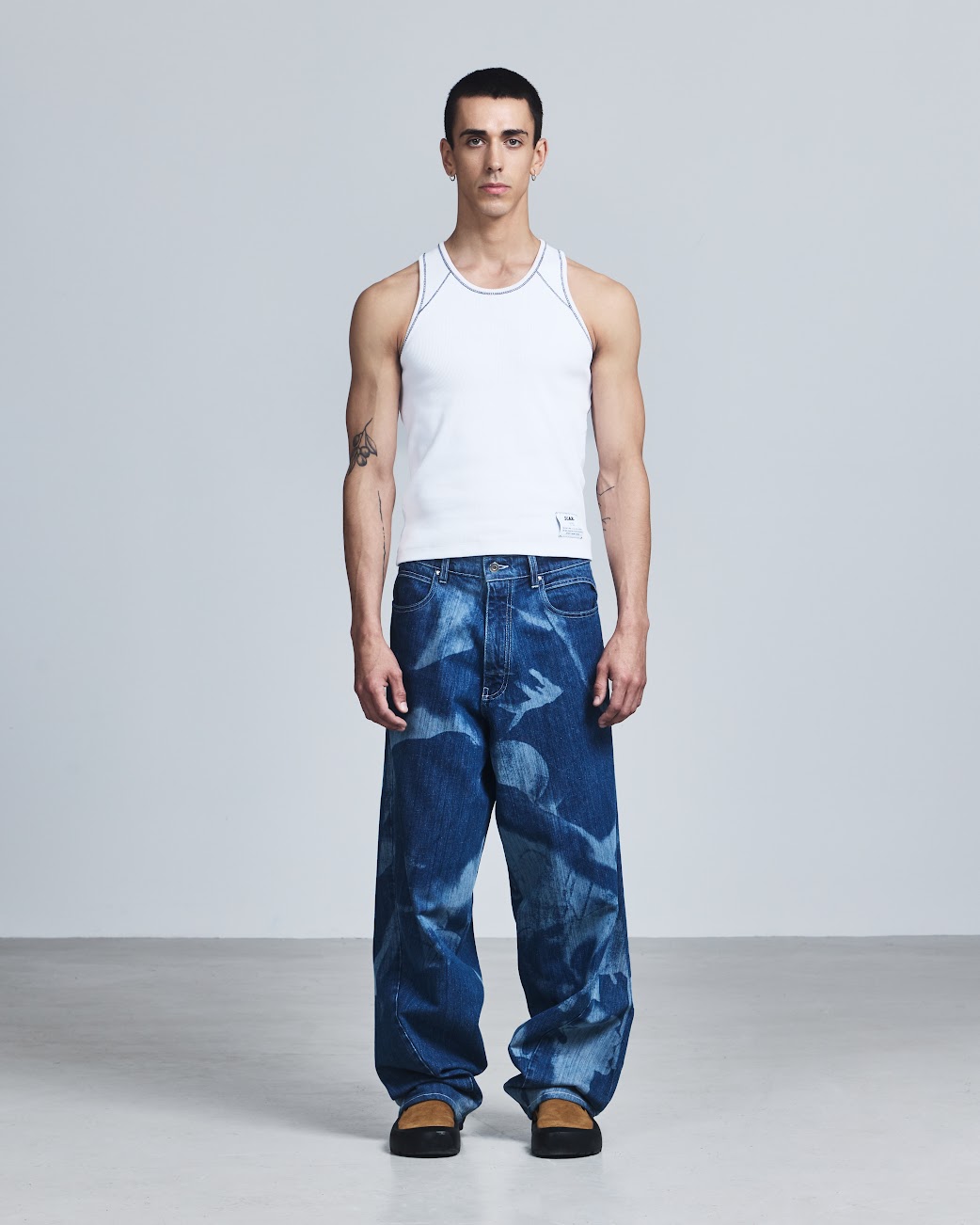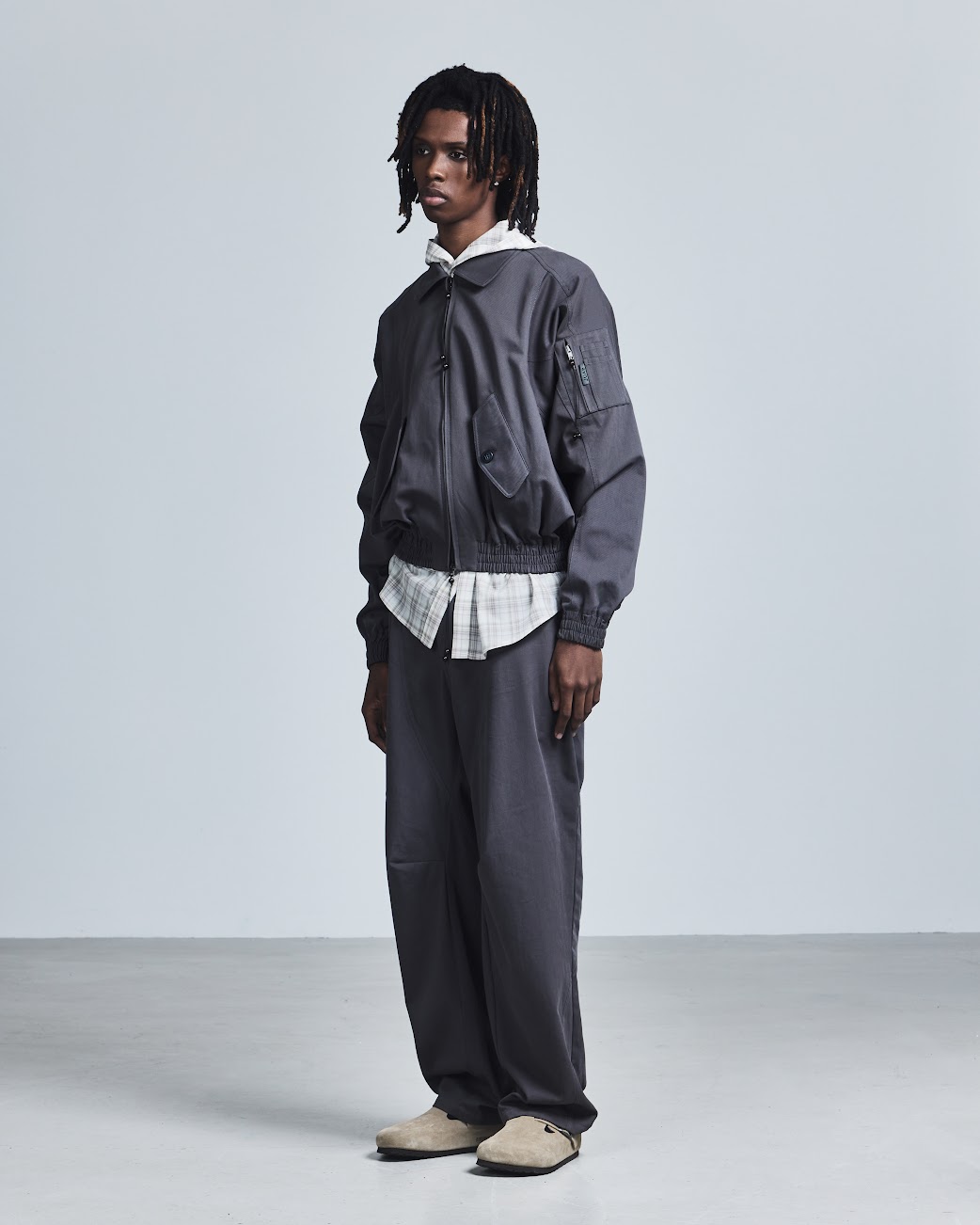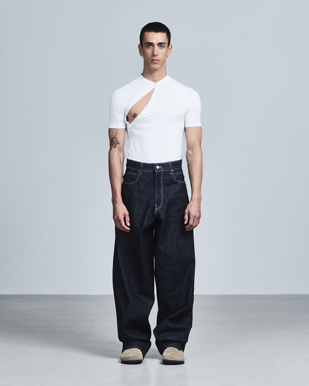 For SS26, he leans fully into the power of touch with EMBRACE, a collection rooted in intimacy, gesture, and physical connection. Movement remains central, but it’s softened by a spiritual, subtly hedonistic energy: stretch Henleys cling to the body with asymmetric fastenings that can be undone to reveal skin, compression tops carry a handprint stretched across the chest, and heavyweight ISKO denim is laser-engraved with hazy images of intertwined bodies. Signature kinetic-cut flight jackets, tracksuits, and sport vests return alongside expanded tailoring, including hooded Oxford shirts in water-resistant poplin plaids. Rendered in muted greys, pale yellows, and soft purples, EMBRACE blurs structure and softness, utility and desire. Part one lands January 14, 2026, with further drops arriving throughout the season.