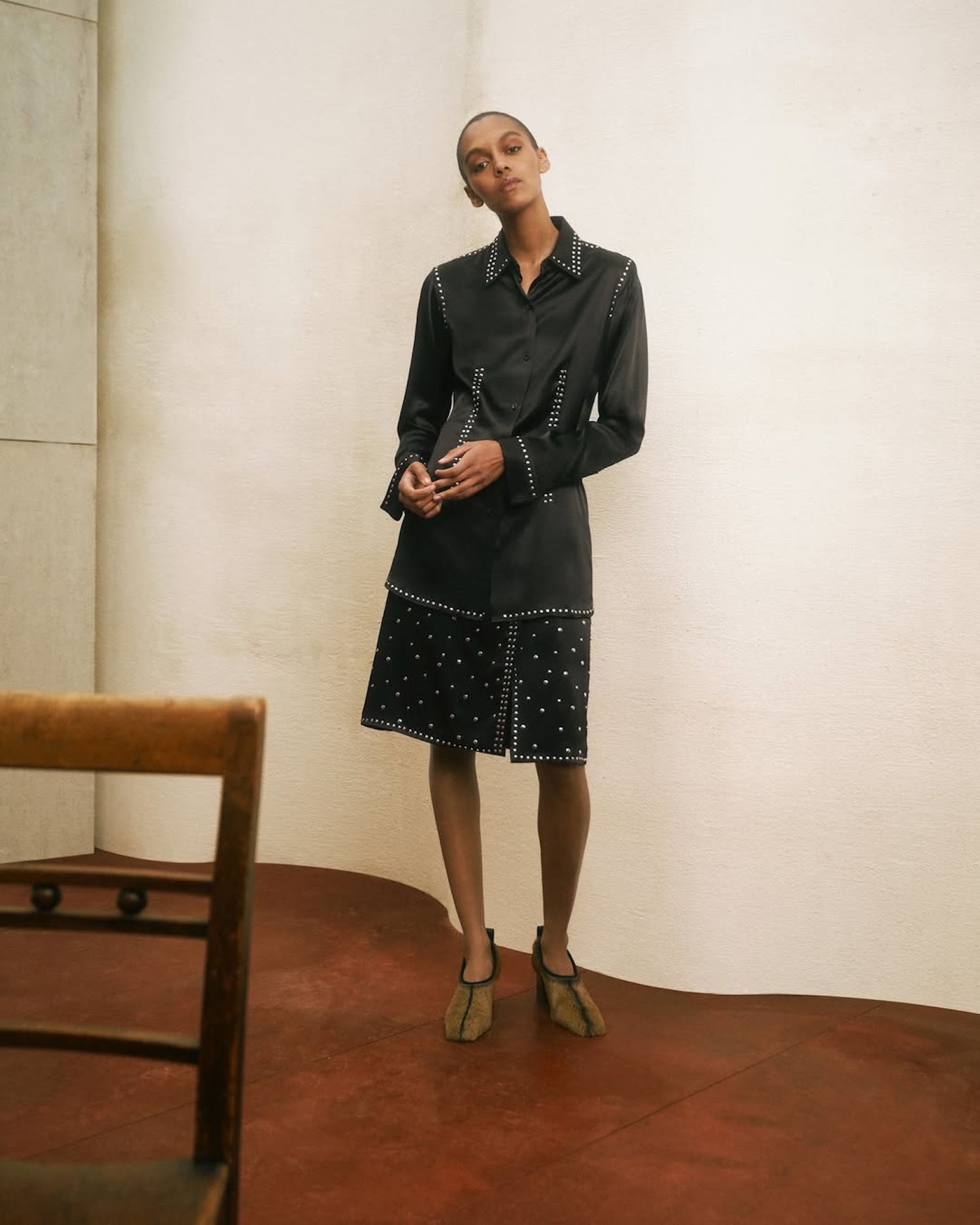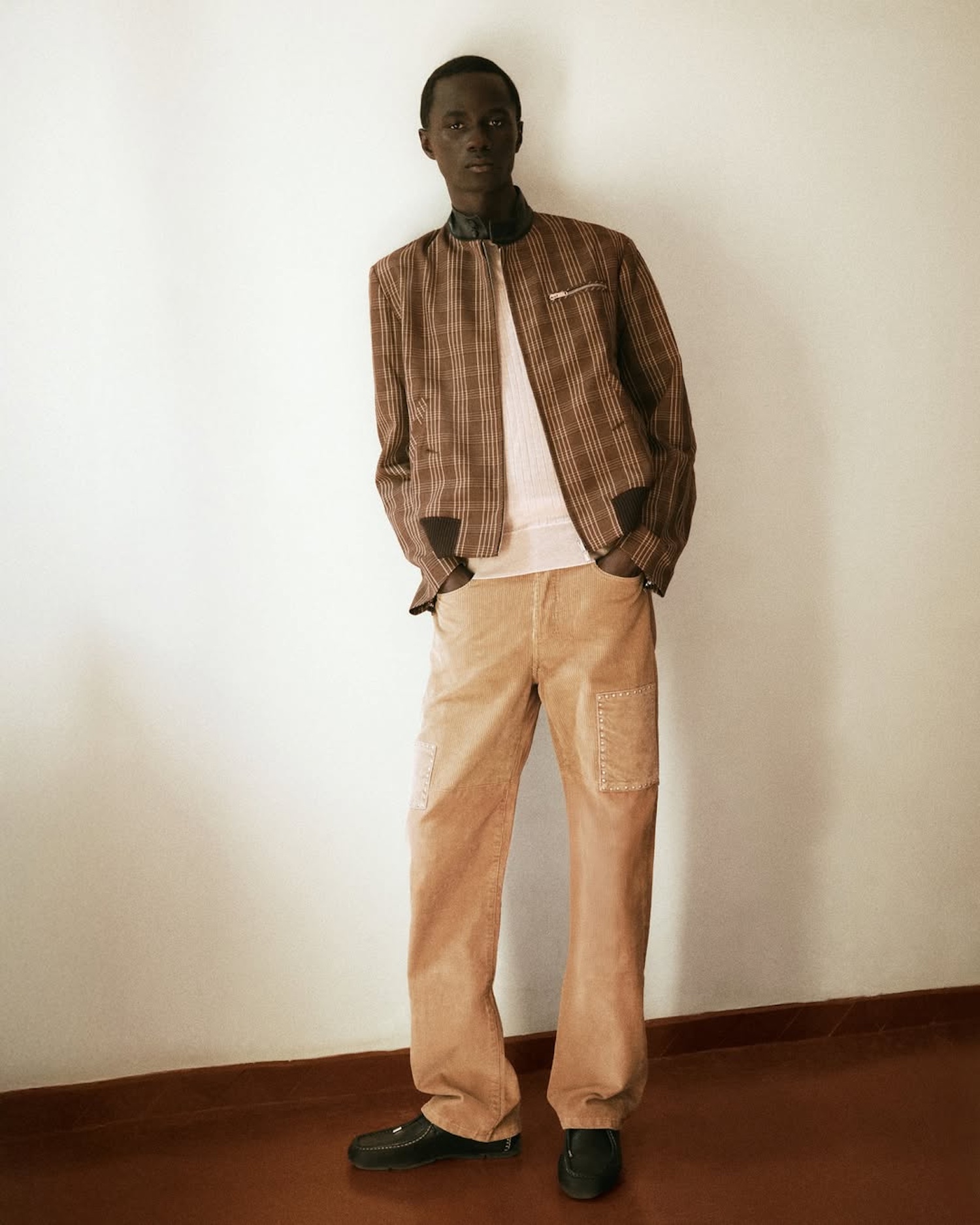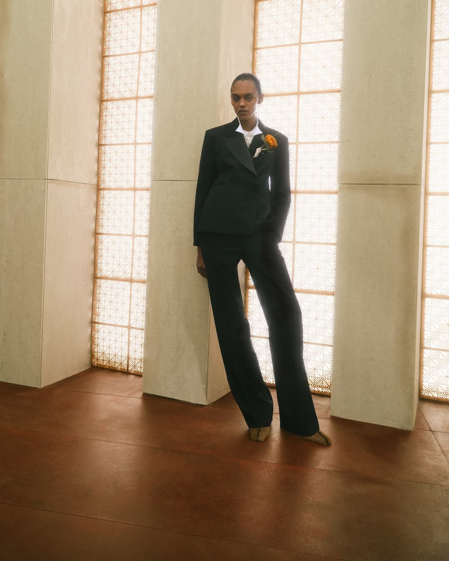 Set to the sound of Coltrane’s ‘Meditations‘, the collection reflects an atmosphere shaped by jazz and Indian musical traditions. Seasonal Madras checks, crinkled Bengal stripes and architectural brooches crafted in Botswana by Beullah Serema and Peter Mabeo complete a narrative rooted in craft, rhythm and cultural dialogue.