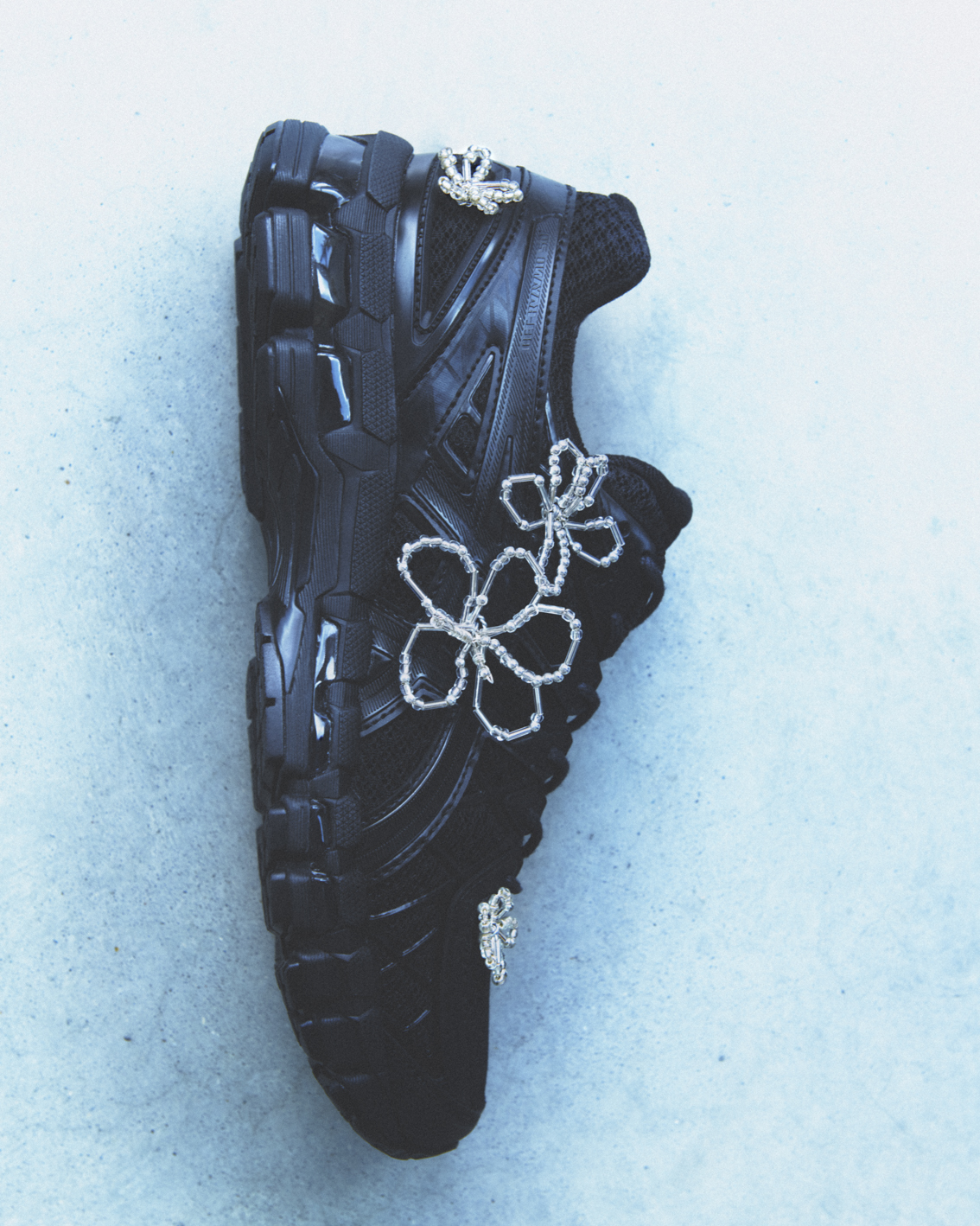 For this drop, the GEL-KAYANO 20 goes all in with textures and trinkets, ditching basic mesh for a chaotic, beautiful mix of mismatched gems, pearlescent bows, and floral motifs handcrafted in their London studio. Coming in both black and white, the three designs play with the tension between movement and stillness, injecting a heavy dose of “jewelery-core” into the heavy-duty running silhouette. The collection hits Completedworks.com and Dover Street Market London on February 21st, right after the show.
