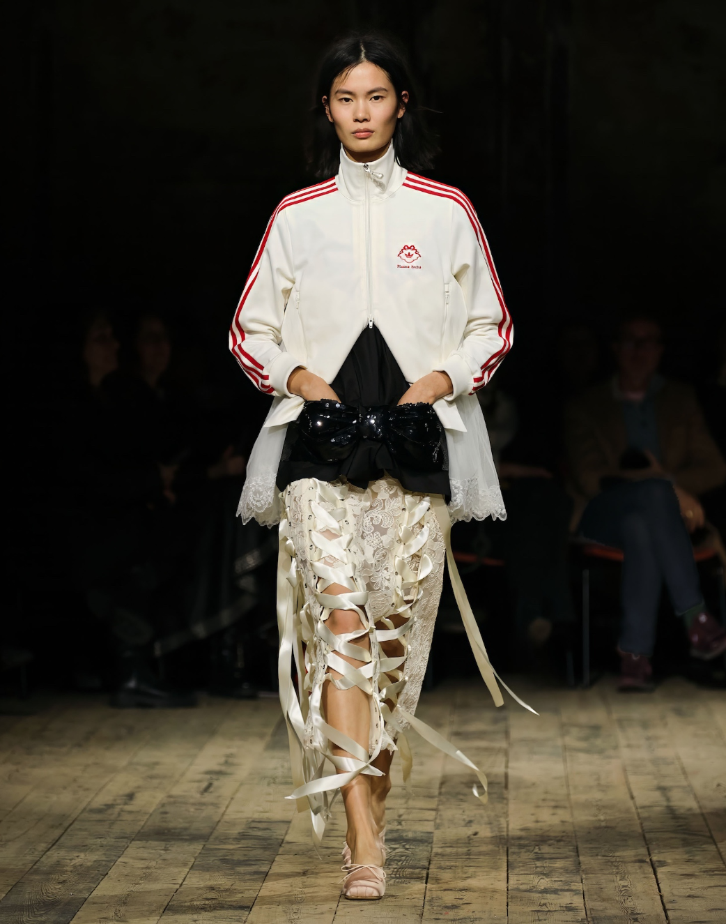 Colour drew from Jack B. Yeats’ painterly tones: moss, oxblood, muted gold, landscape over costume. Then came the Adidas Originals collab: stripes down lace-trimmed sleeves, track jackets over tulle skirts, silk sport shorts, bow-adorned trainers. Sport sharpened the mythic narrative. Rocha’s femininity is never sentimental, here it’s precise, poetic, and pointed.