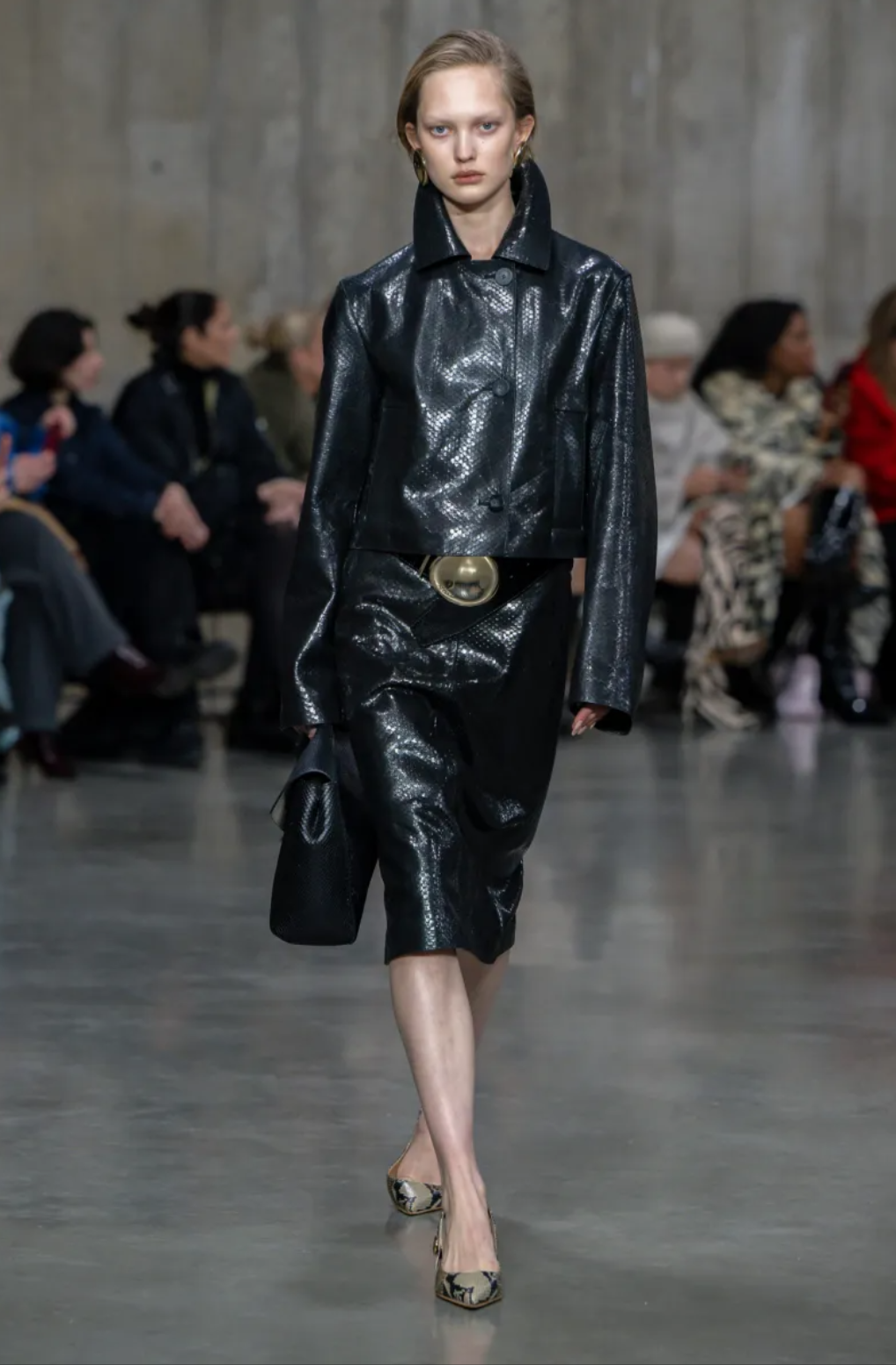 Outerwear, still the backbone, carried the collection. Silk poplin trenches skimmed the body, lambskin bombers felt lean, shearling was handled with restraint. The palette moved with confidence, grounded in deep city tones rather than pastoral nostalgia.