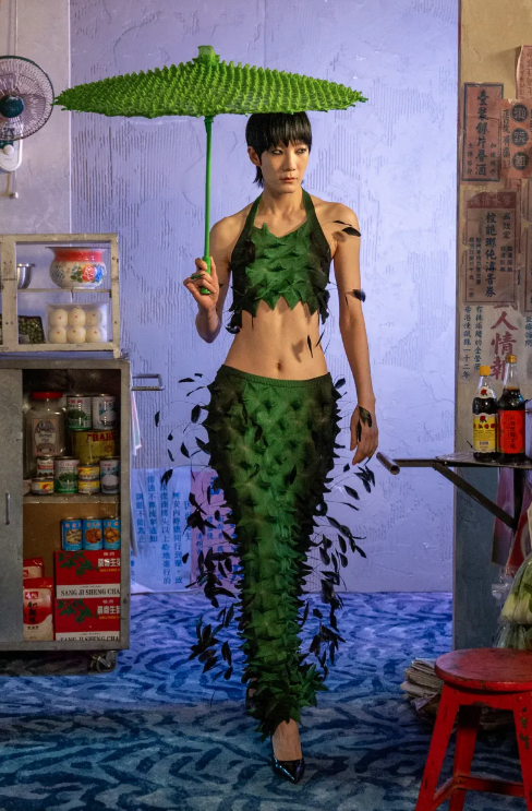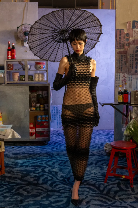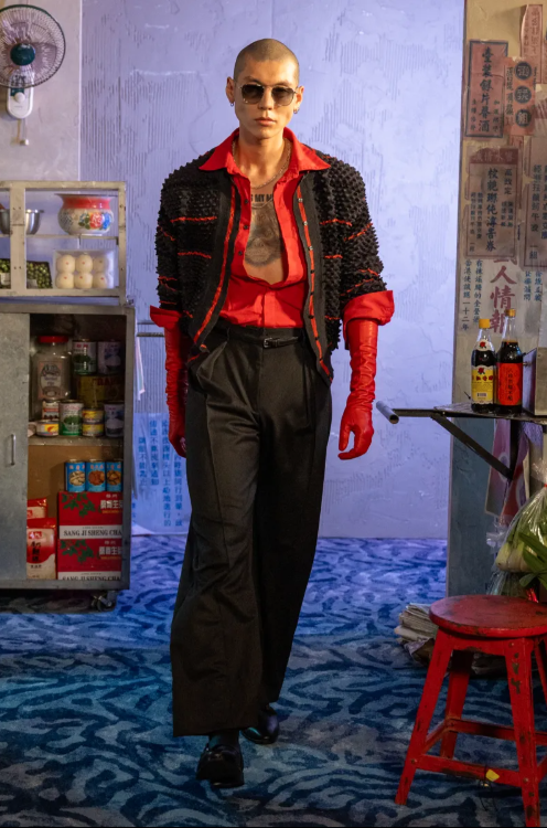 Chet Lo rebuilt Hong Kong’s night market inside the Mandarin Oriental. Guests could shop from stalls, bubble tea on every seat. Spikes remained but refined; silhouettes sleeker, knits bristling with control.