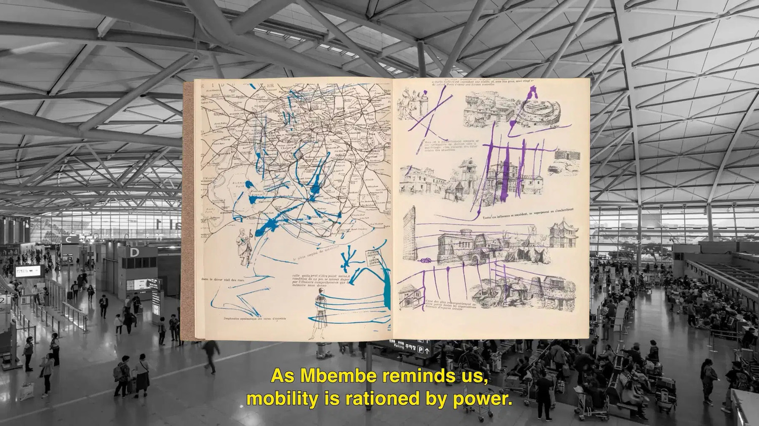 Kandis’ “A Travel Guide: Black Gothic in South Korean Horror” tracks her journey through South Korea in a video collage with a stream of associative thought. From hip-hop to K-pop, she finds links between Black and Korean musical forms while tracing through similar intercultural histories of militarisation and state violence. Highlighting the words of Cameroonian historian Achille Mbembe, Kandis examines the politics of power, mobility, and racialised governance.