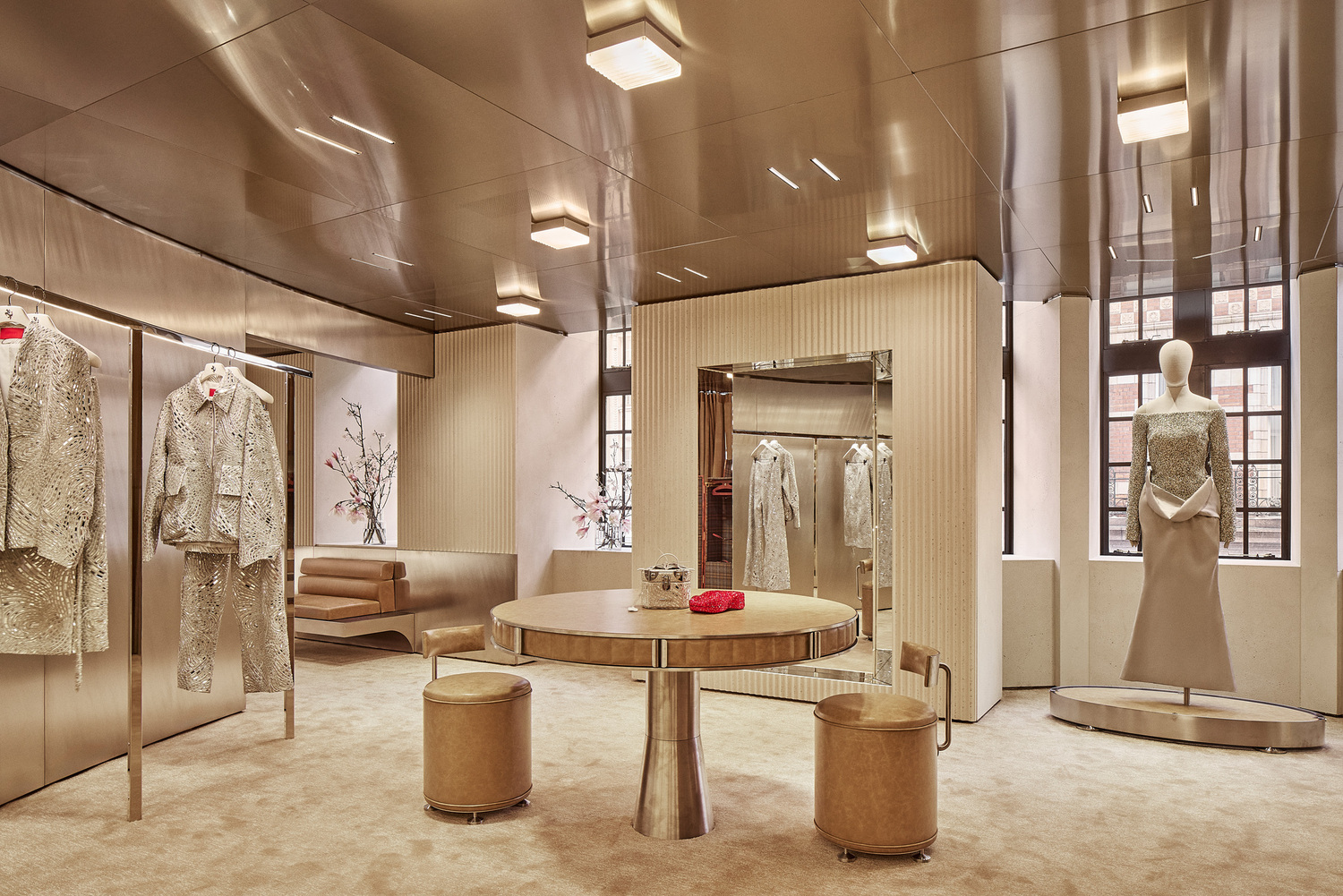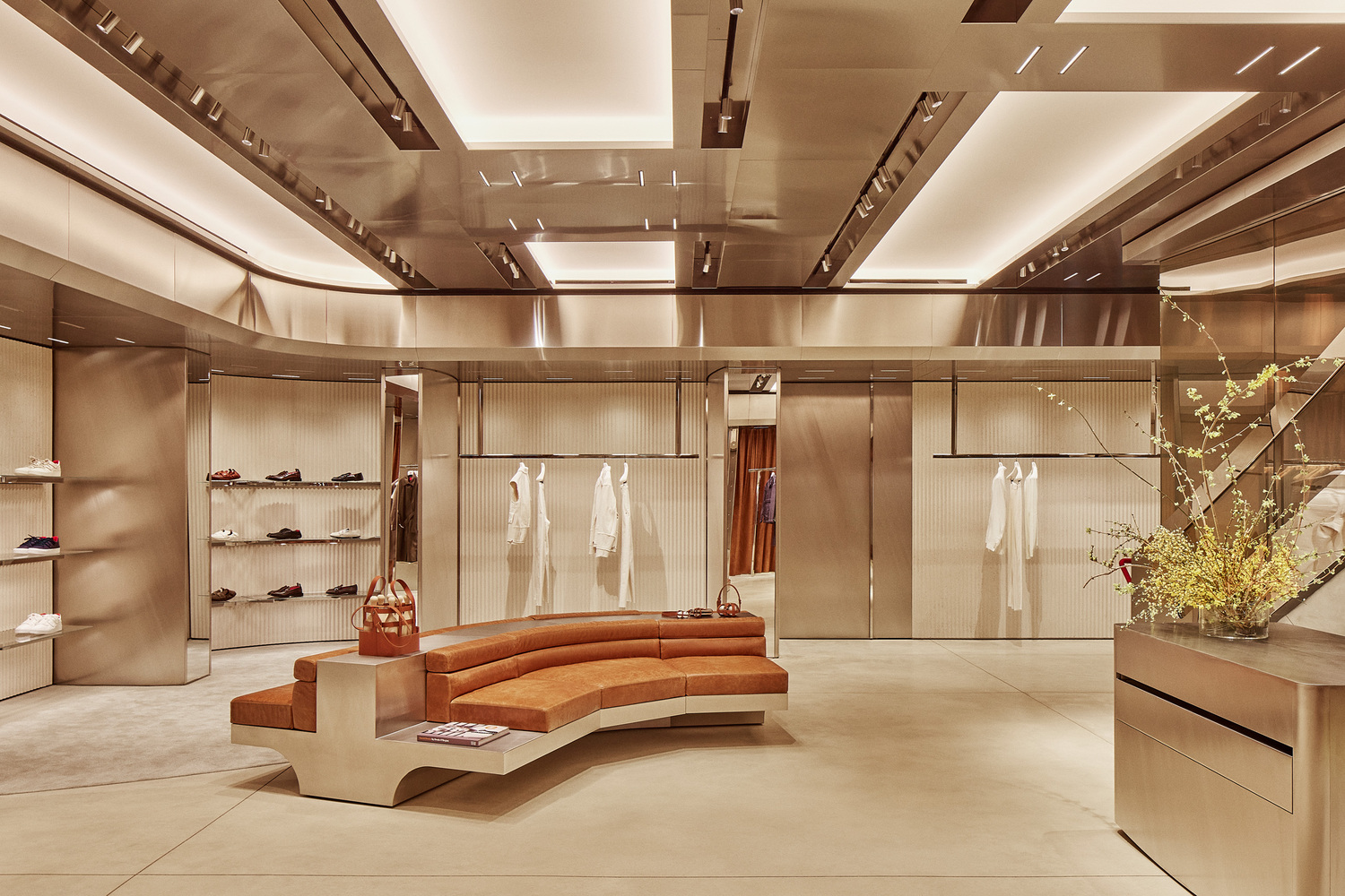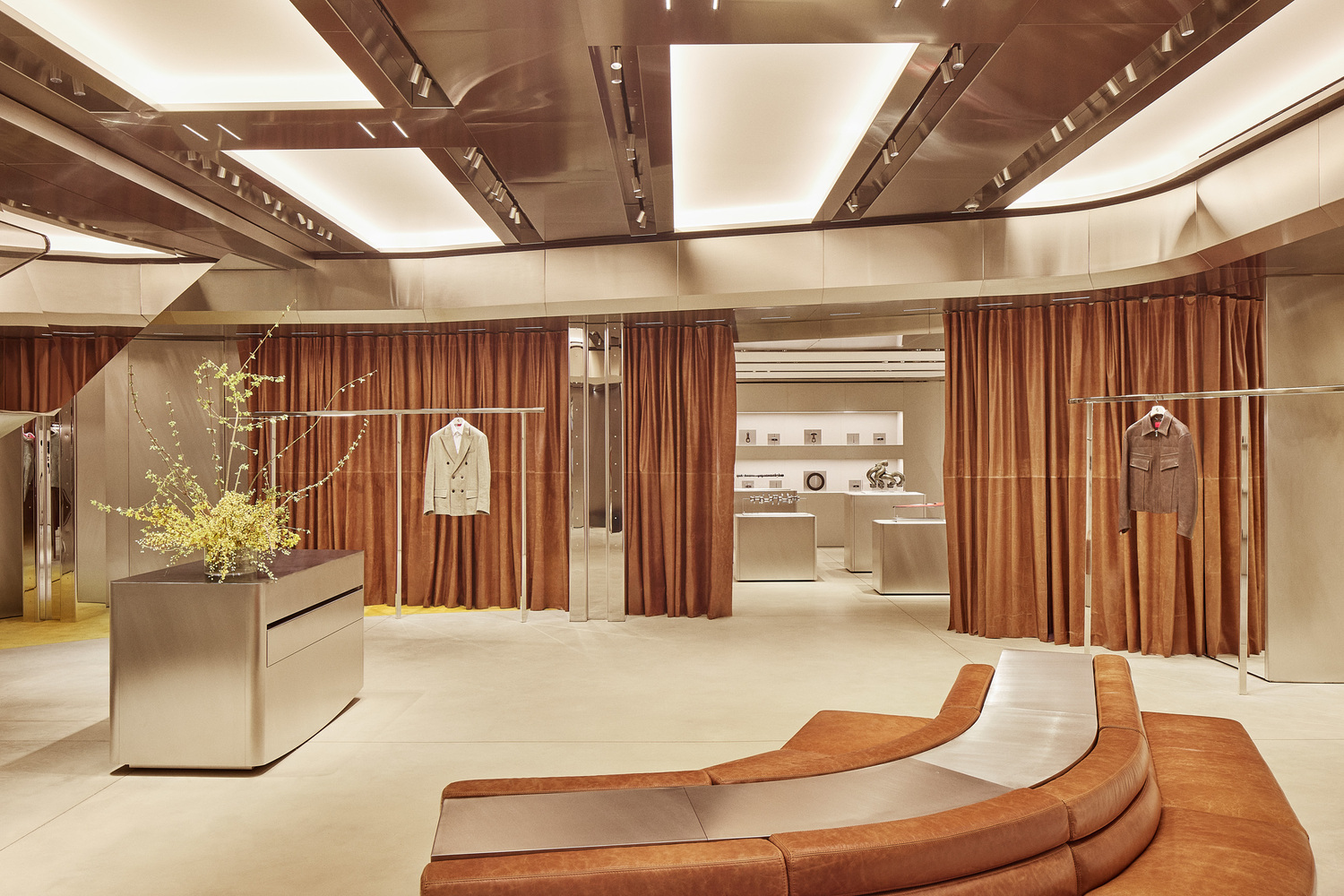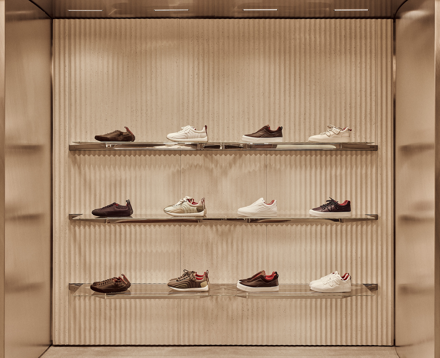 Ferrari Style’s women’s and men’s ready-to-wear, accessories, and collectibles are all available across multiple levels. Caveau, a private chamber dedicated to Ferrari components and Maranello collectibles, is located on the basement level. Women’s ready-to-wear and made-to-order creations from the Tailor Made Atelier exist on the upper floor. Centred around a circular table, the Atelier is cocooned by floor-to-ceiling leather curtains expressing Ferrari’s importance to materiality and craft. Rocco emphasised that “every material and detail has been chosen to express the evolving language of Ferrari Style.”