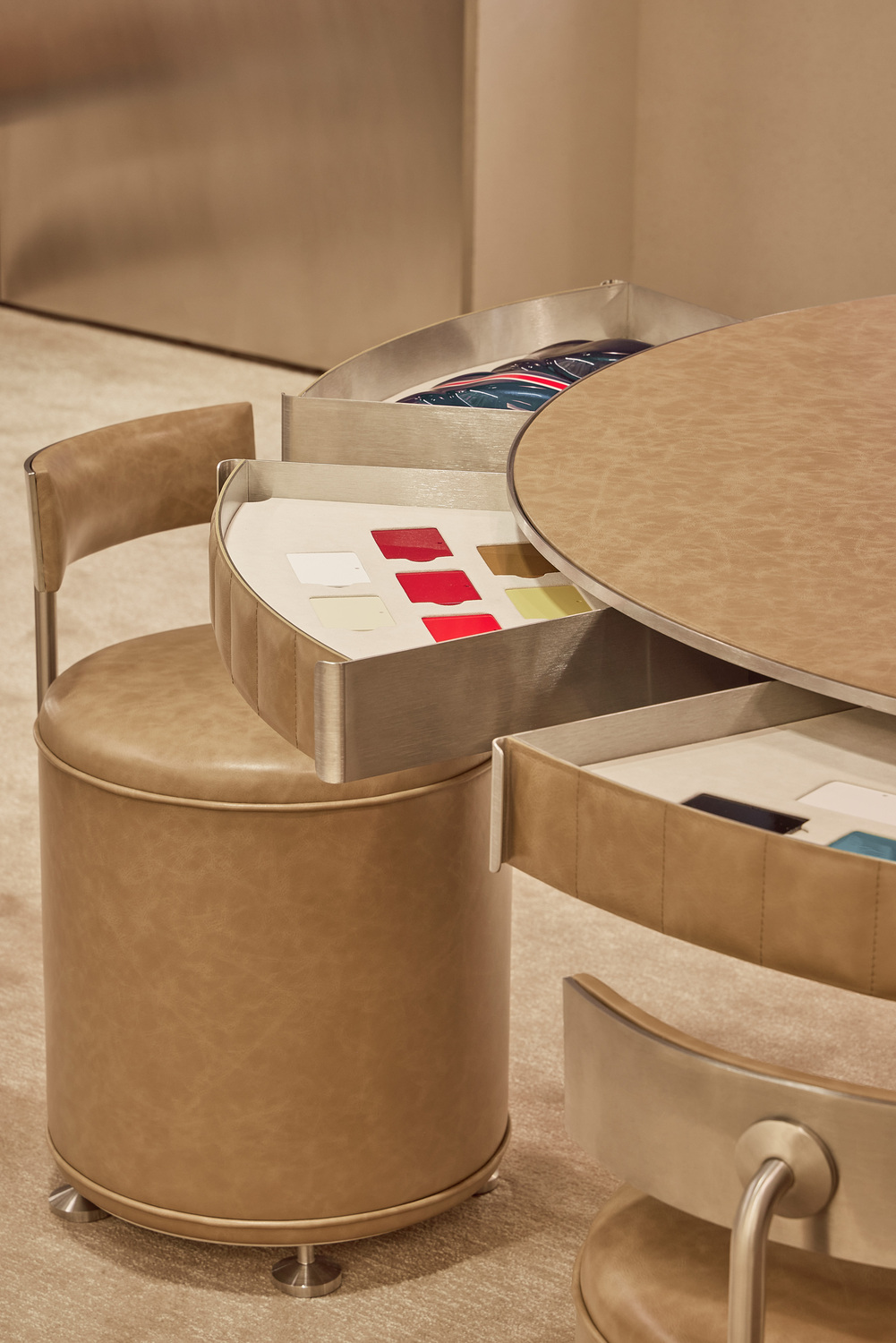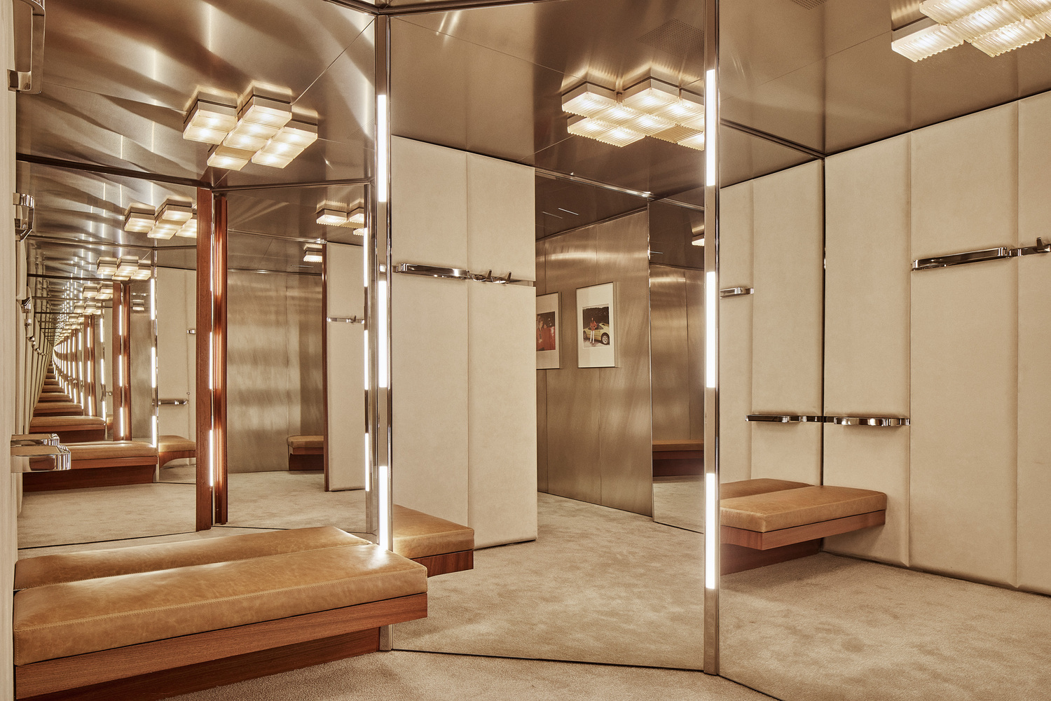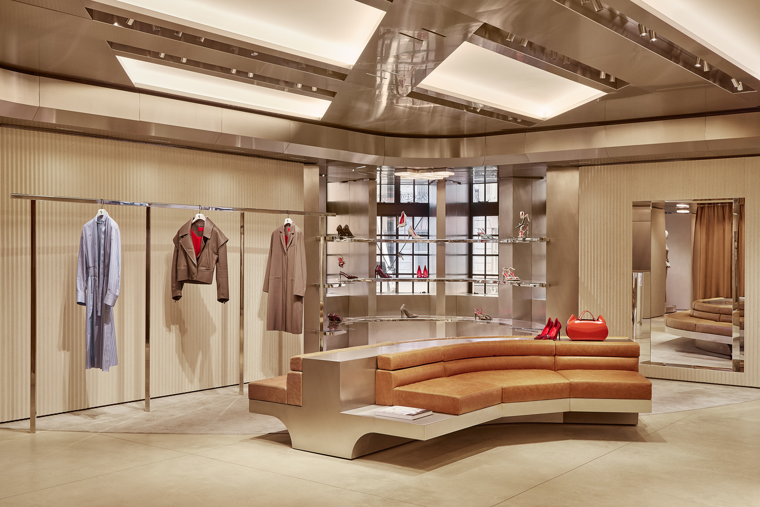 Ferrari Style’s women’s and men’s ready-to-wear, accessories, and collectibles are all available across multiple levels. Caveau, a private chamber dedicated to Ferrari components and Maranello collectibles, is located on the basement level. Women’s ready-to-wear and made-to-order creations from the Tailor Made Atelier exist on the upper floor. Centred around a circular table, the Atelier is cocooned by floor-to-ceiling leather curtains expressing Ferrari’s importance to materiality and craft. Rocco emphasised that “every material and detail has been chosen to express the evolving language of Ferrari Style.”
