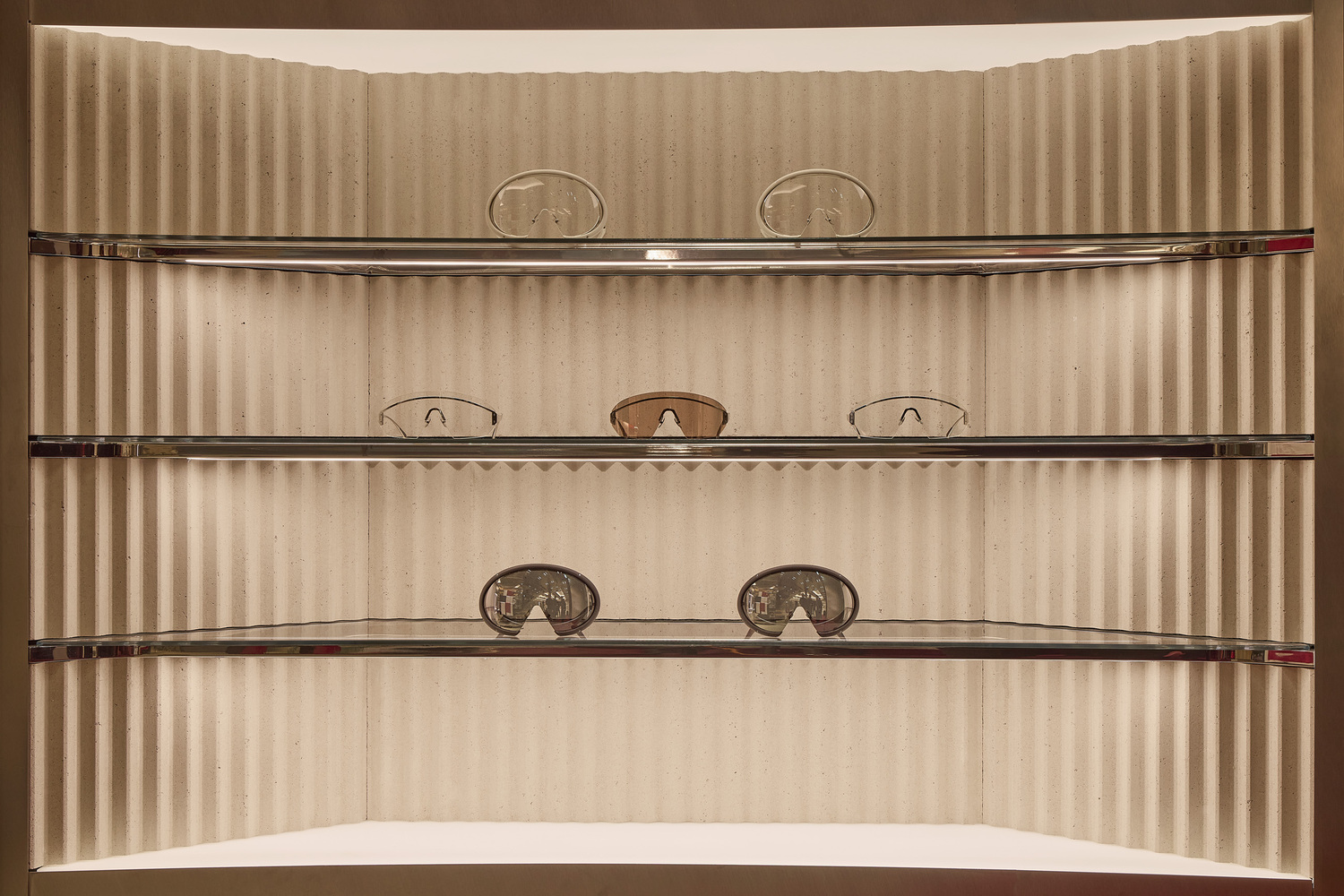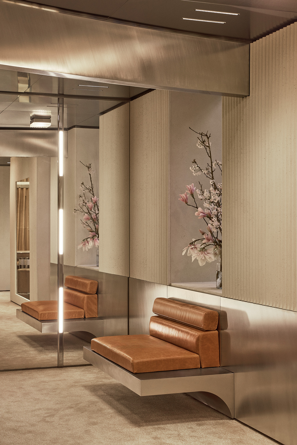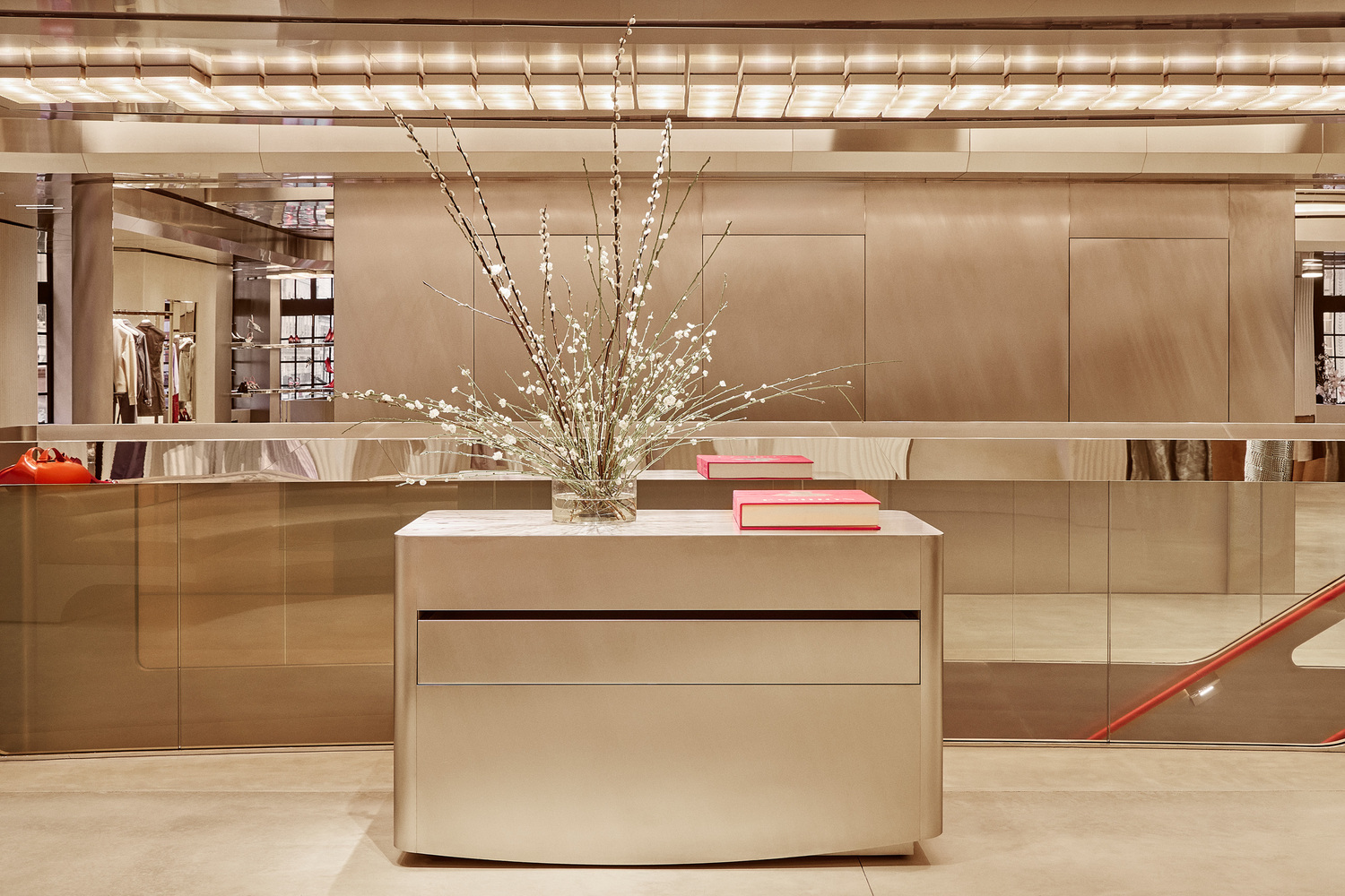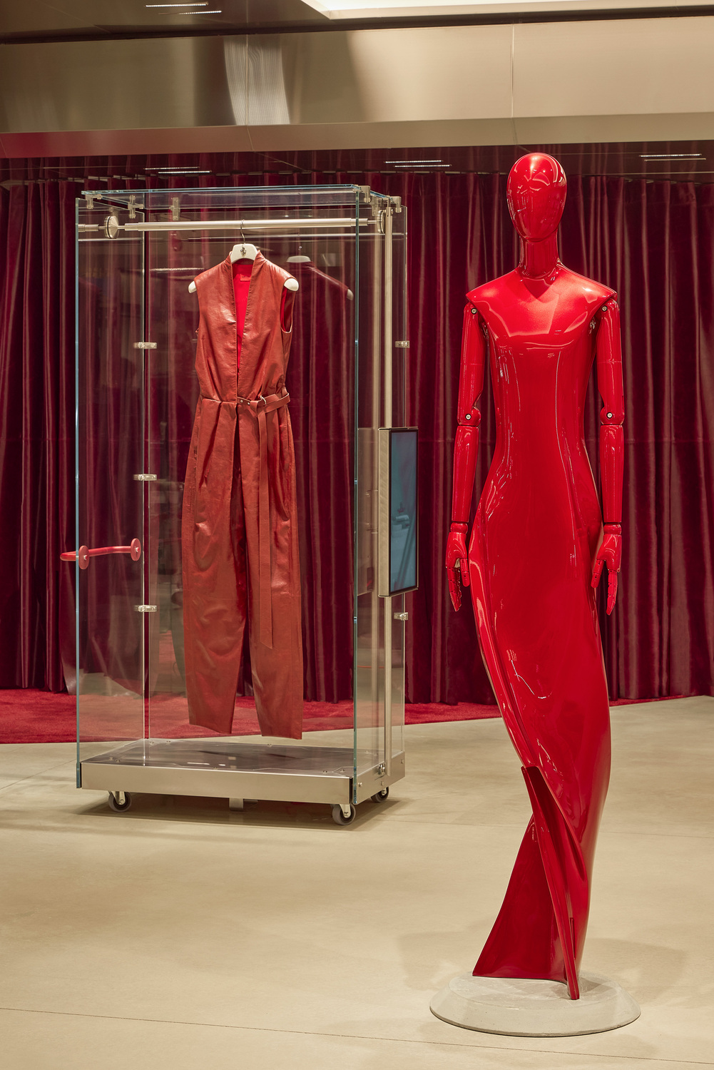 Ferrari Style’s women’s and men’s ready-to-wear, accessories, and collectibles are all available across multiple levels. Caveau, a private chamber dedicated to Ferrari components and Maranello collectibles, is located on the basement level. Women’s ready-to-wear and made-to-order creations from the Tailor Made Atelier exist on the upper floor. Centred around a circular table, the Atelier is cocooned by floor-to-ceiling leather curtains expressing Ferrari’s importance to materiality and craft. Rocco emphasised that “every material and detail has been chosen to express the evolving language of Ferrari Style.”
