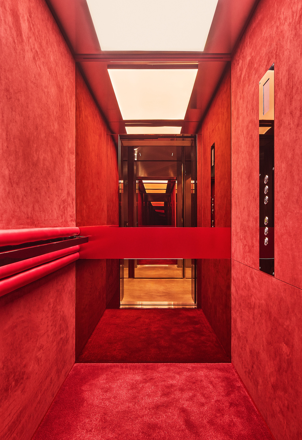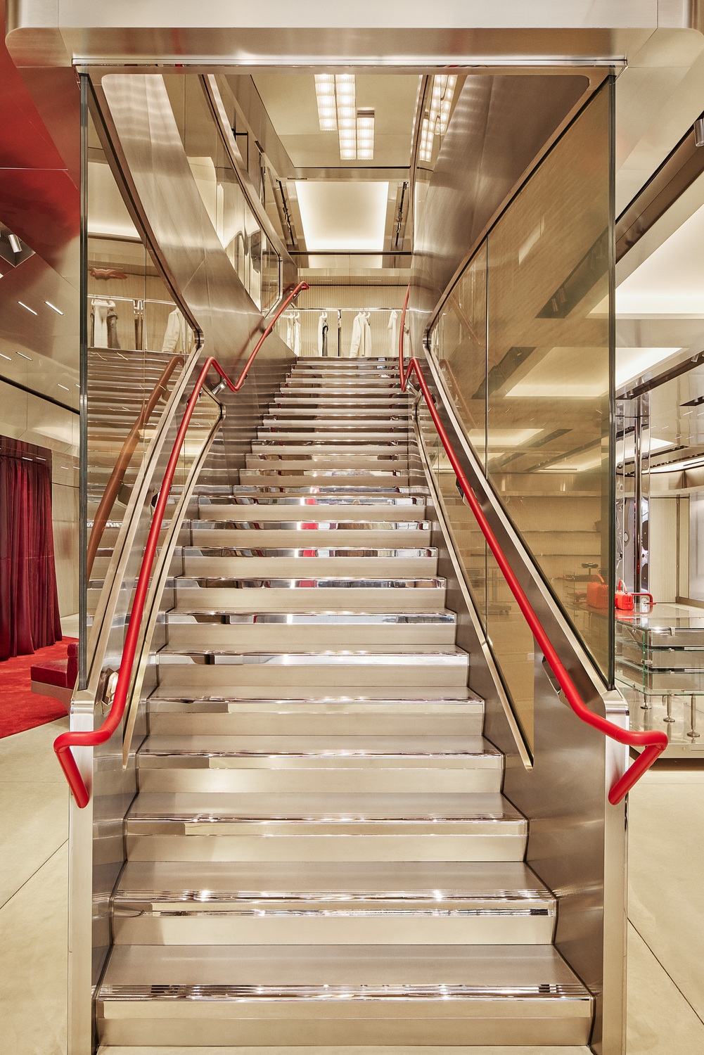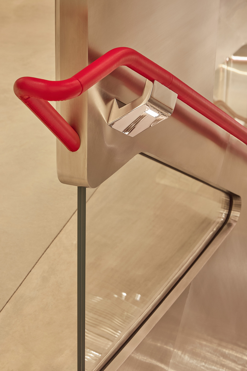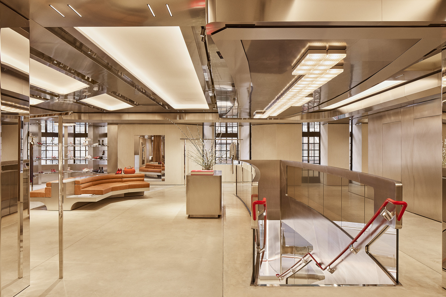 Housed within a 20th-century Queen Anne-style building, the historic exterior contrasts with the contemporary interior. The stainless steel perimeter envelops the space with a utilitarian, concrete flooring that reflects the technical appreciation of the Ferrari Officina. Alongside the industrial floors and ceilings, splashes of Ferrari’s iconic red accentuate the environment.