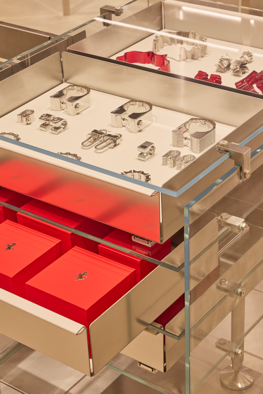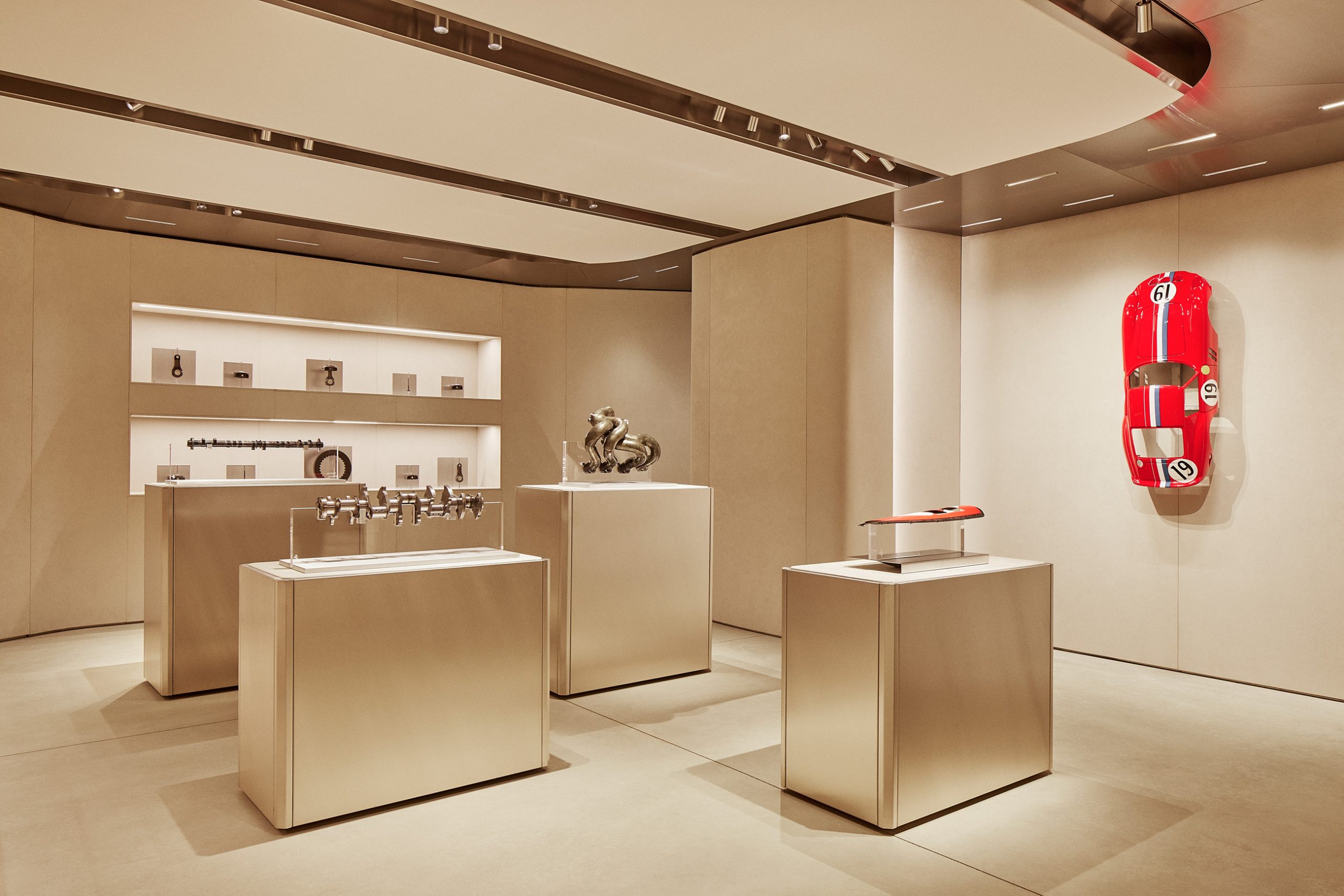 In a collaboration with a Berlin-based architectural firm (Gonzalez Haase ASS) and a Milanese design studio (Formafantasma), the 850 sq metre space was curated by Ferrari Style’s Creative Director, Rocco Iannone. Inspired by the Officina, the Ferrari garage where their motors are showcased, the space is more than just a retail environment. It is a workshop where Ferrari’s design principles of precision, experimentation, and craftsmanship are upheld.