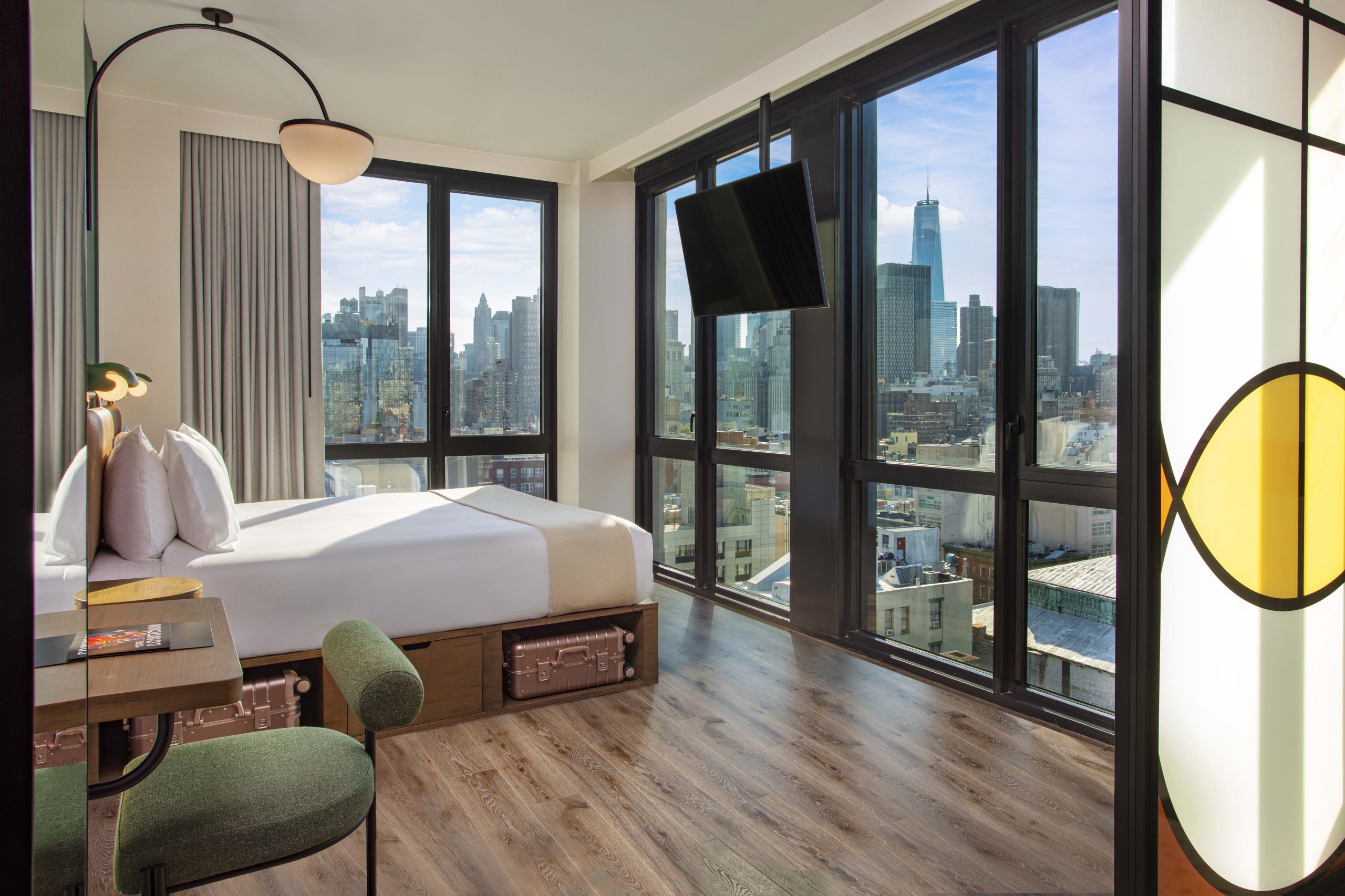 ceiling windows which look out onto city views, which is always a great touch to any New York stay, while bathrooms lean design led with rain showers, terrazzo floors and statement details. It’s compact living, but done with thoughtfulness and personality.