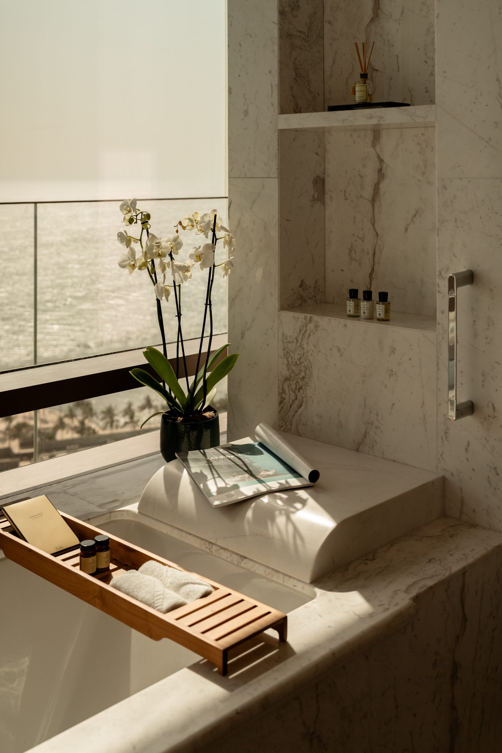 Design leans into calm rather than statement. Muted blues, warm neutrals and subtle textures echo the coastline without becoming thematic. Marble bathrooms feel grand and spacious, storage is thoughtful, and layouts feel intuitive rather than formulaic. Everything feels well thought out, from the in-room amenities to the high-quality bedding and technology.