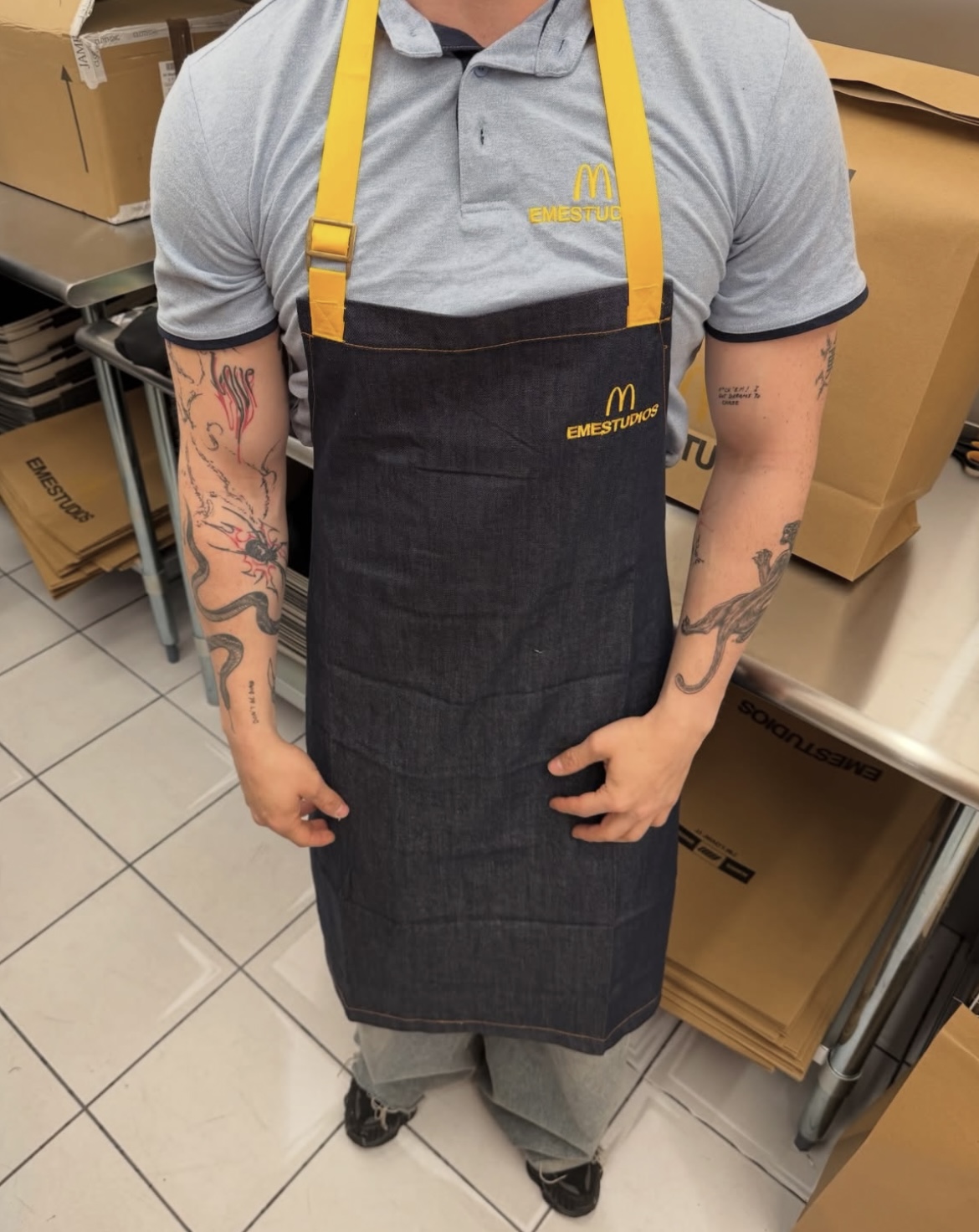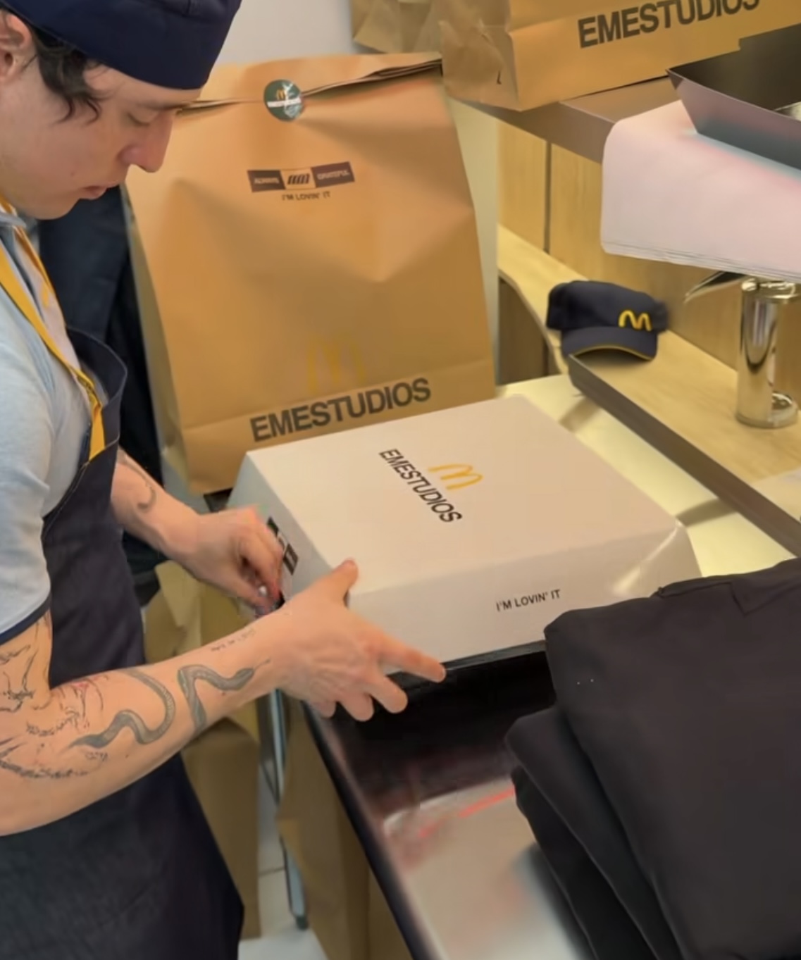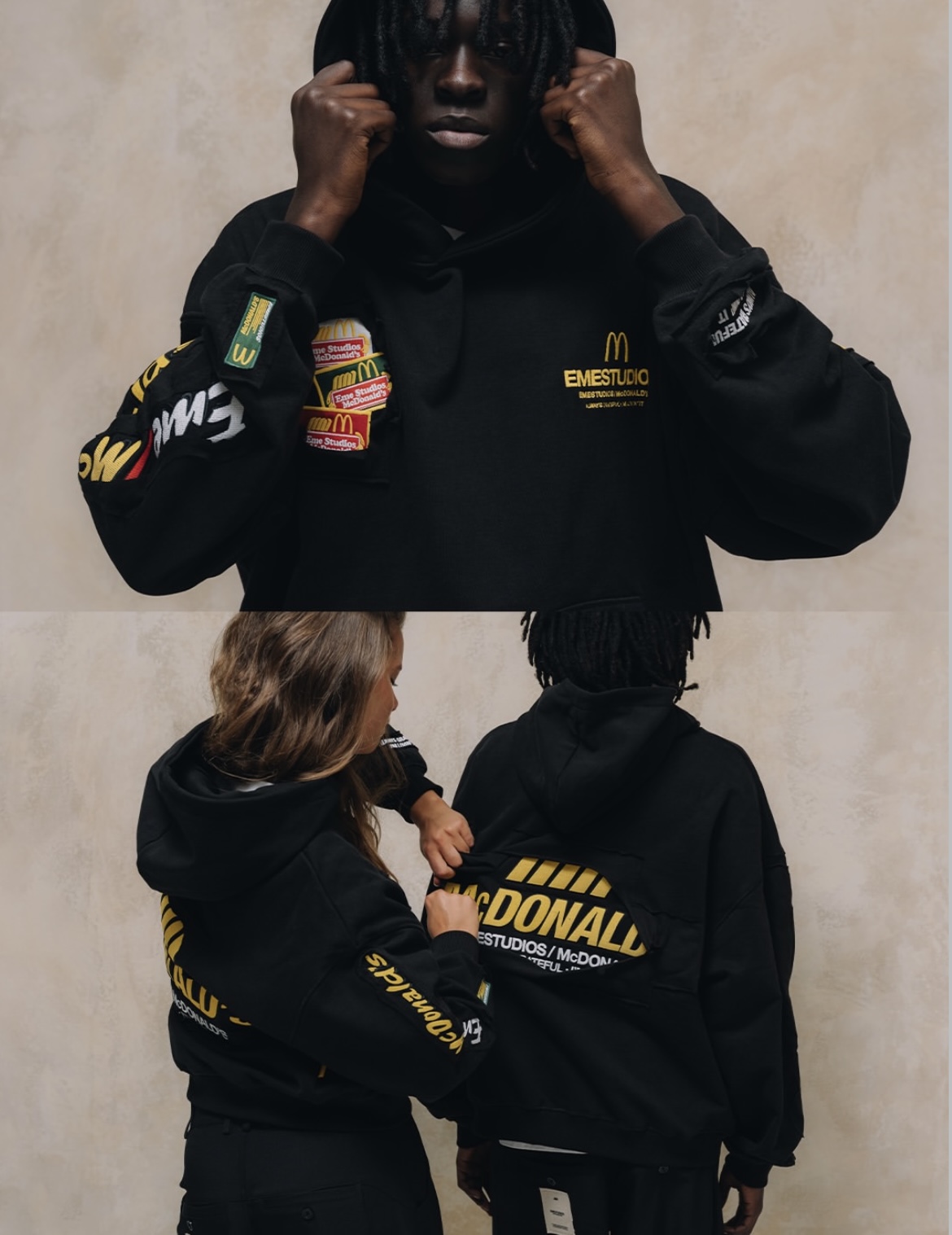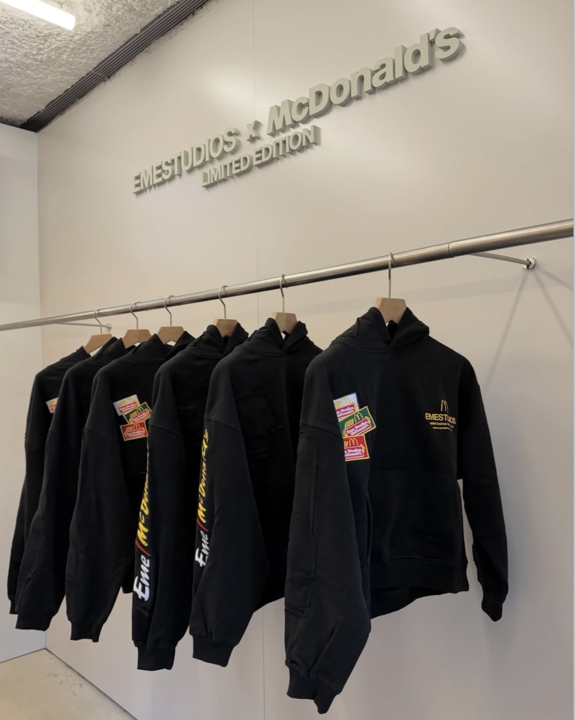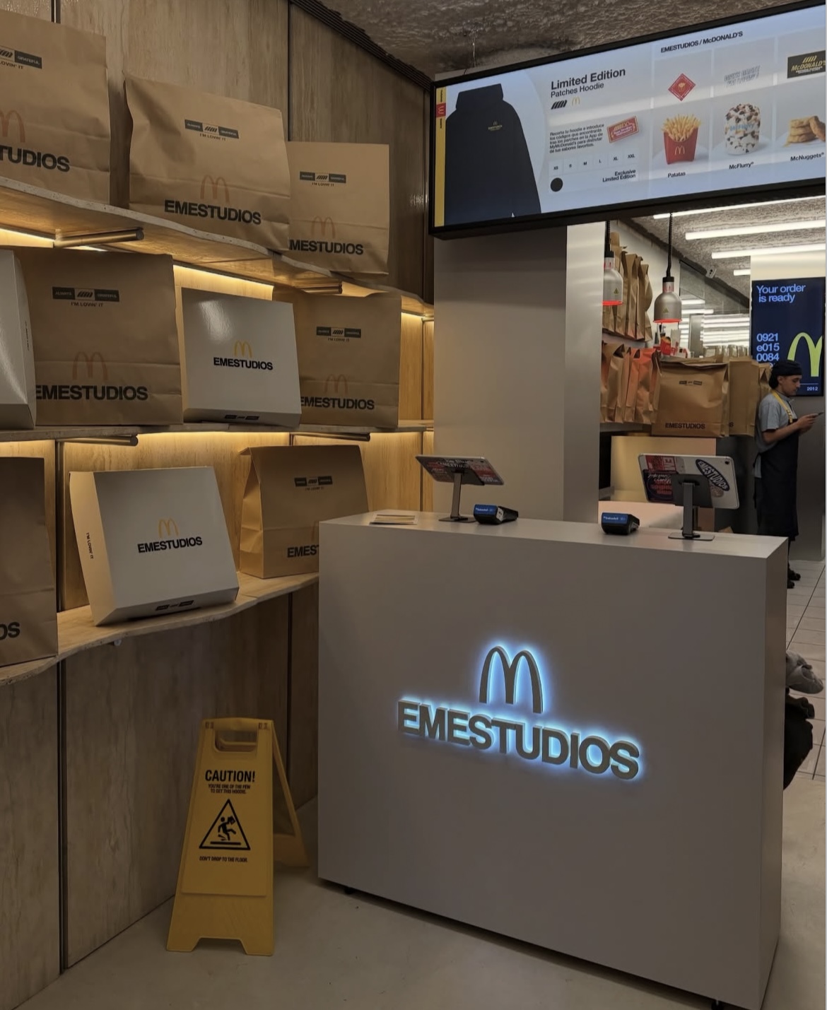 A few days ago, the streetwear brand Eme Studios turned its main flagship store into a full-on “fast-food kitchen,” delivering customers their orders in custom boxes and packaging straight from their McDonald’s collab. Yes, you heard it right, exclusively in Spain, the cult streetwear label has teamed up for a limited-edition hoodie that’s literally designed to be cut apart.