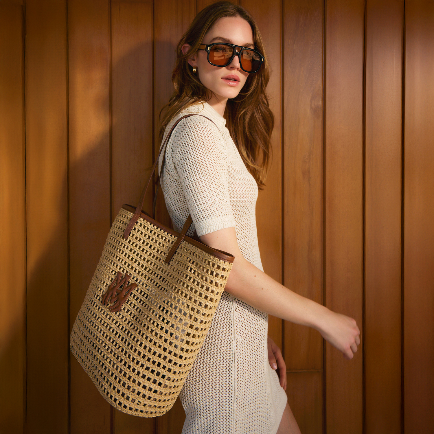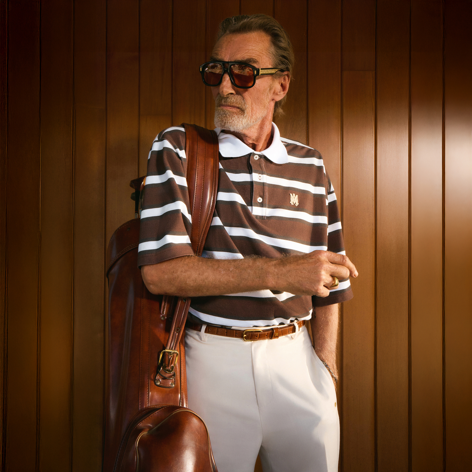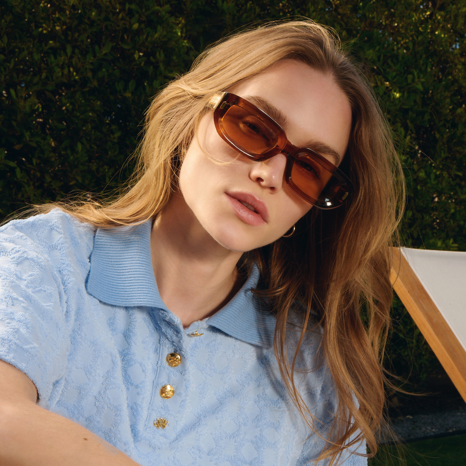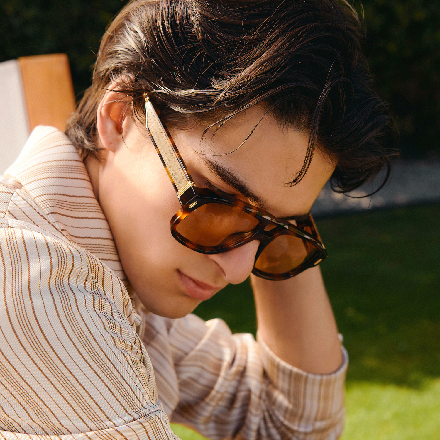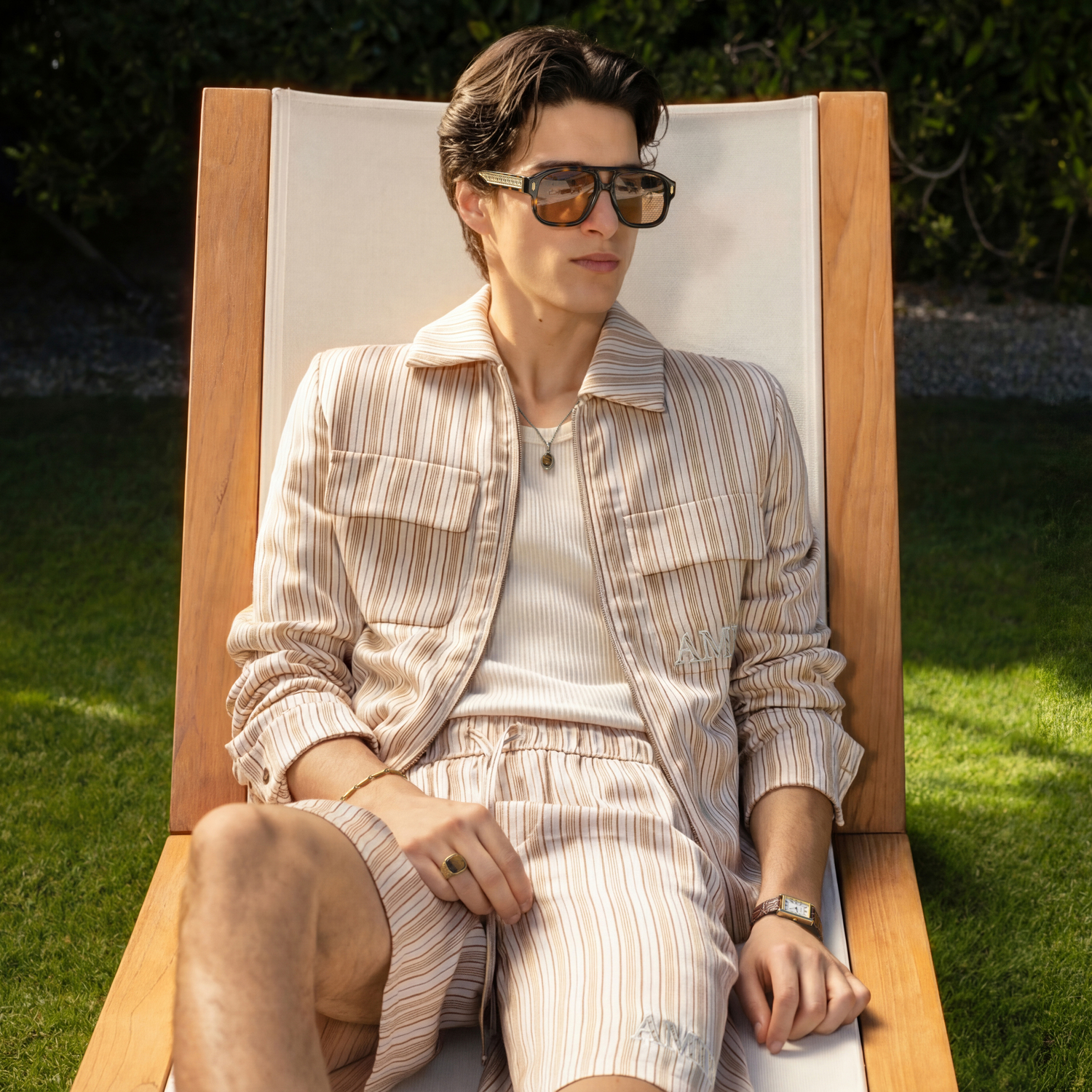 Inspired by the furnishings of signature Palm Springs hotels, subtle striped detailing elevates the sportswear pieces to give a retro feel. High-waisted trousers, and slender knit dresses stay close to the body. Featuring a sleek aviator frame, the Sunset sunglasses frame the entire look. Materiality is valued through the use of supple silks, airy cottons and fine crochet for the women’s tennis dresses and men’s polo shirts.
