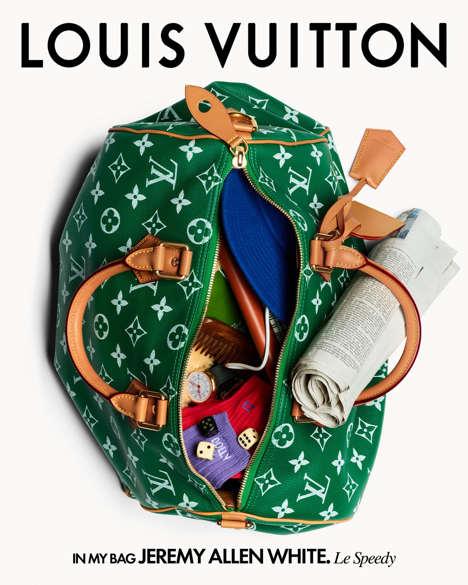 Golden Globe-winning actor Jeremy Allen White fills his Speedy 9 with a comb, watch, extra socks, a charging cable, along with a copy of today’s newspaper. English footballer Jude Bellingham’s red version has his passport, aviators, Louis Vuitton’s Ombre Nomade scent, and keys. American rapper Future includes a tennis racquet, gold chain, gummy candies and a fresh pair of sneakers.