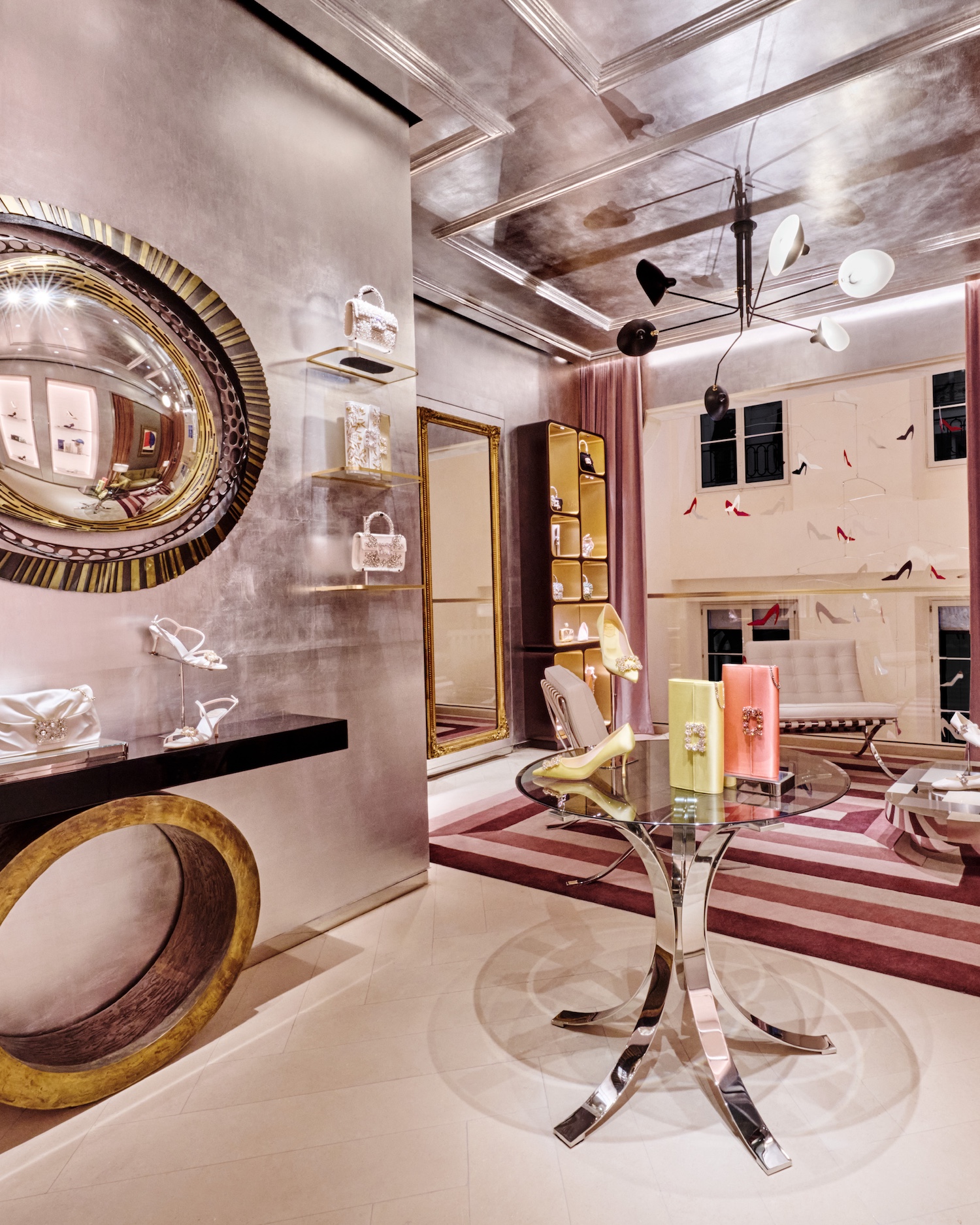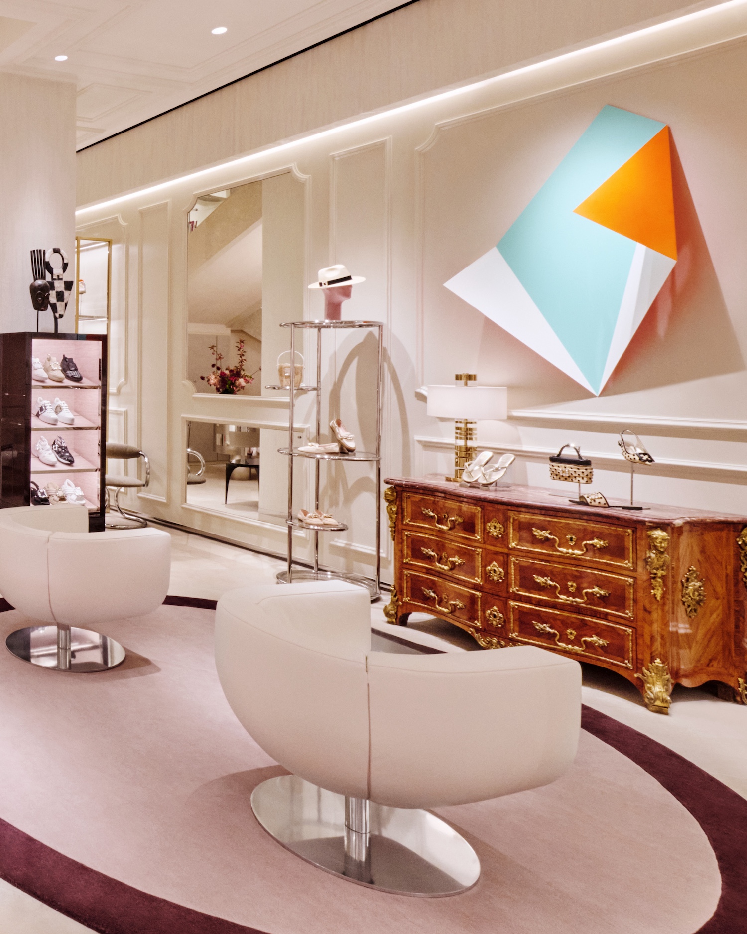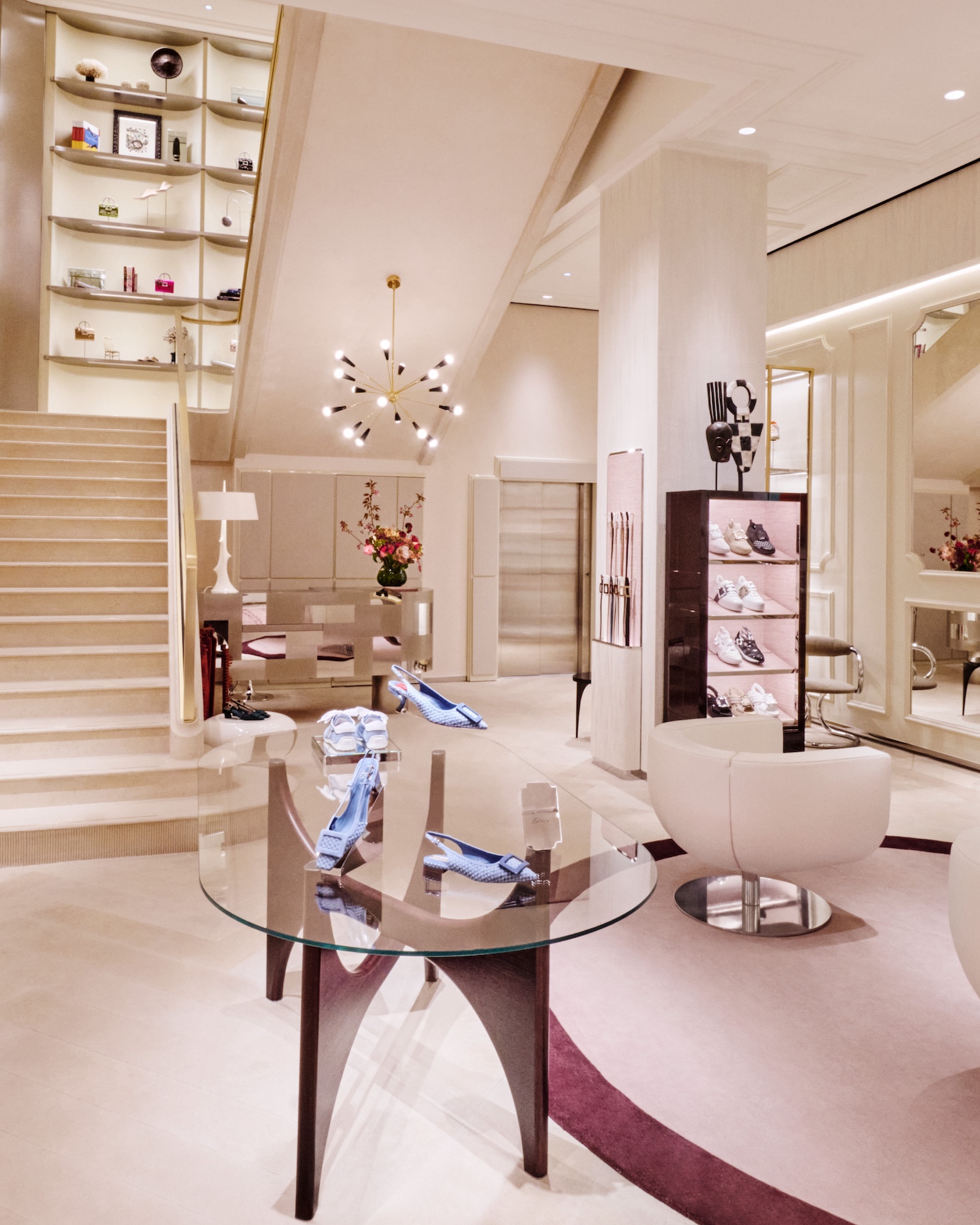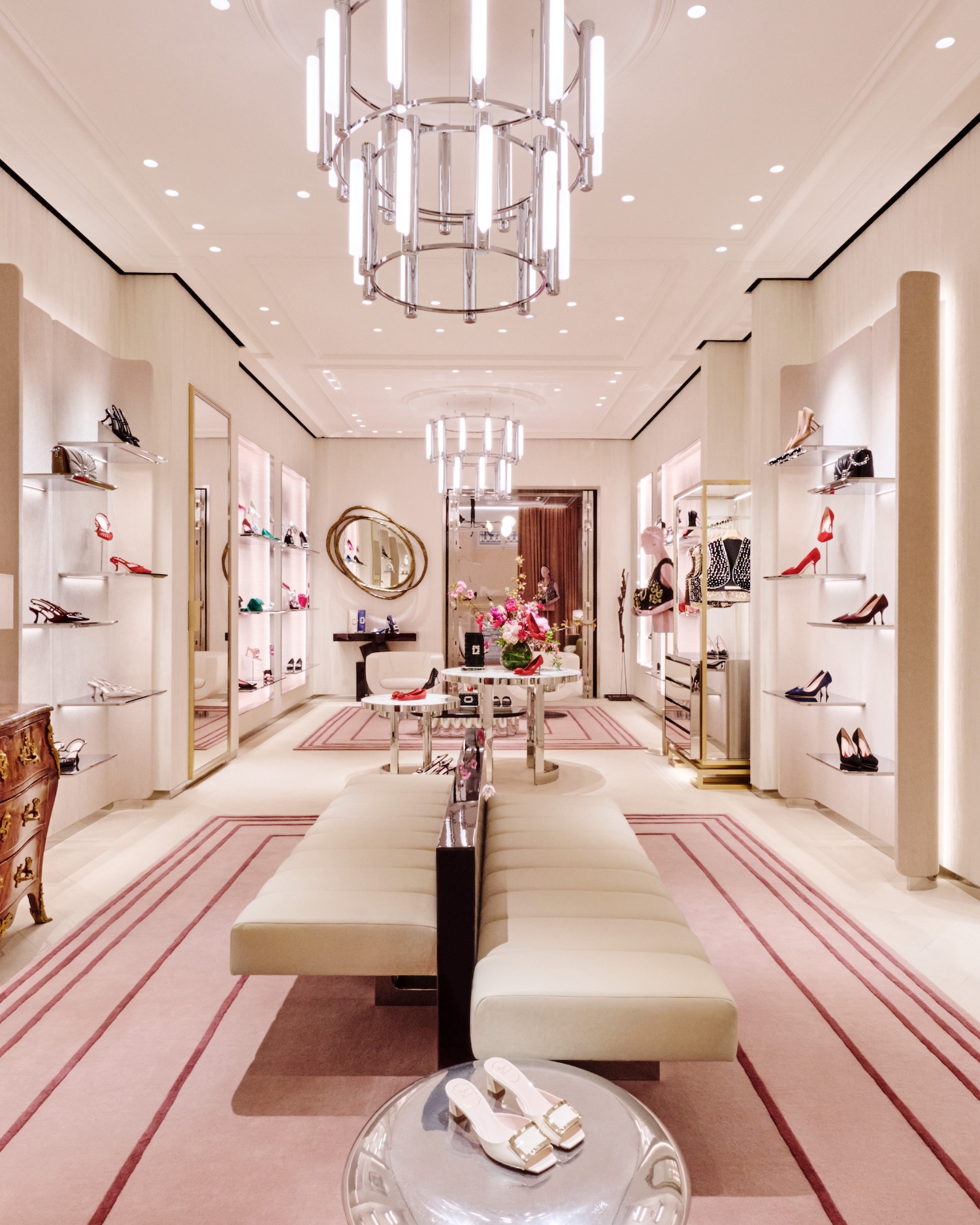 Designed as both a boutique and an extension of the brand’s visual language, the interior blends French materials with a layered mix of furniture, antiques and artworks. A dedicated Atelier Vivier space introduces made-to-order services, allowing clients to customise footwear and accessories within a more private setting.