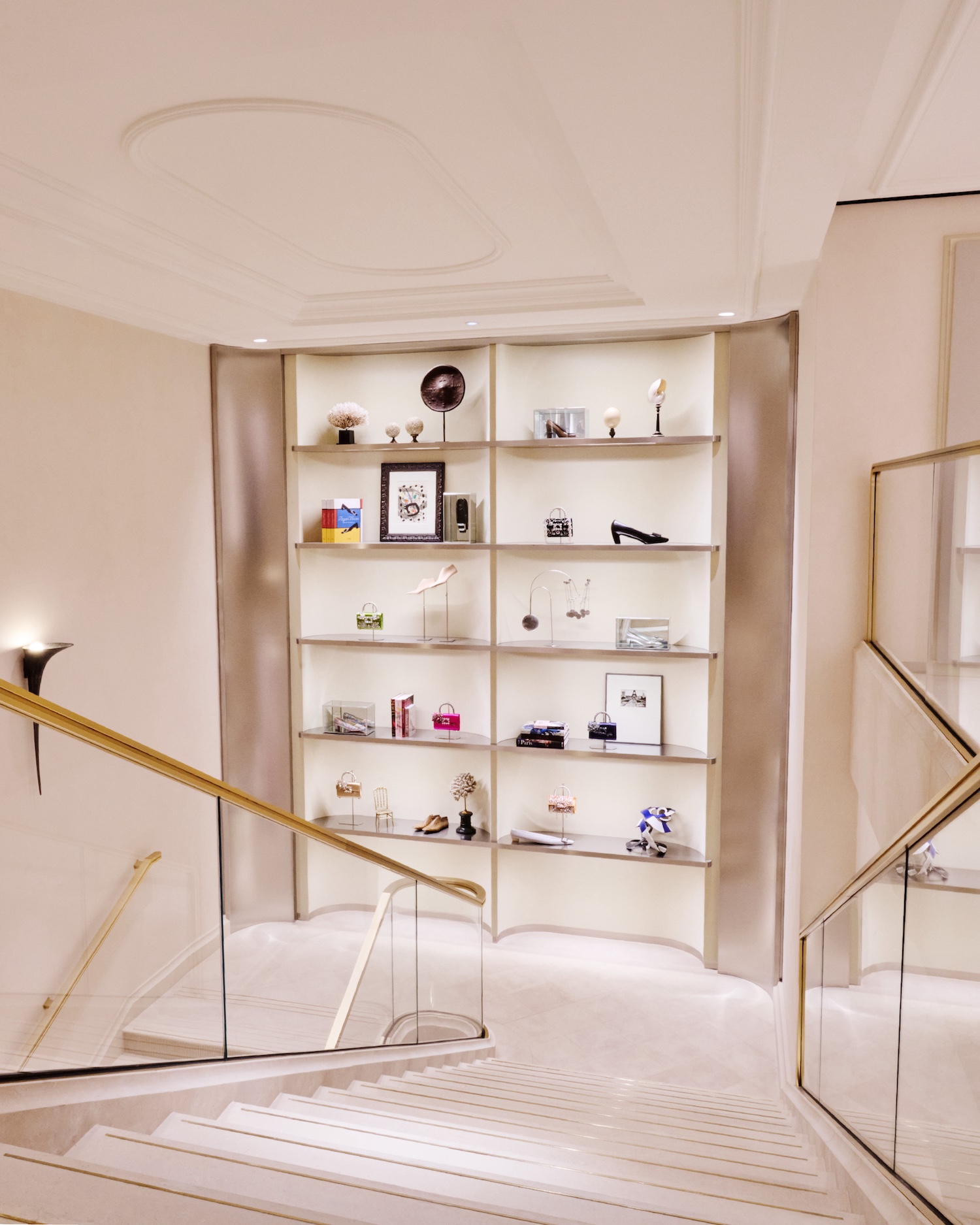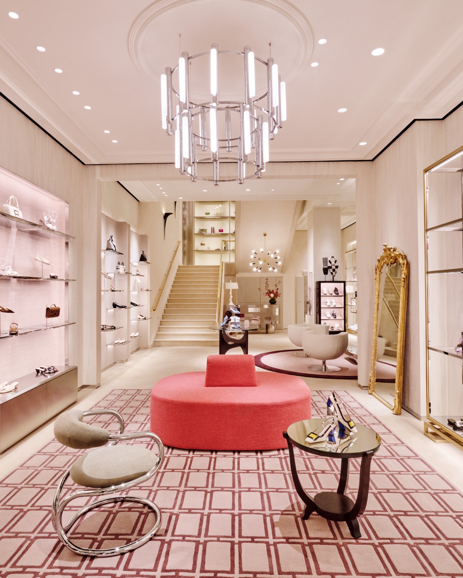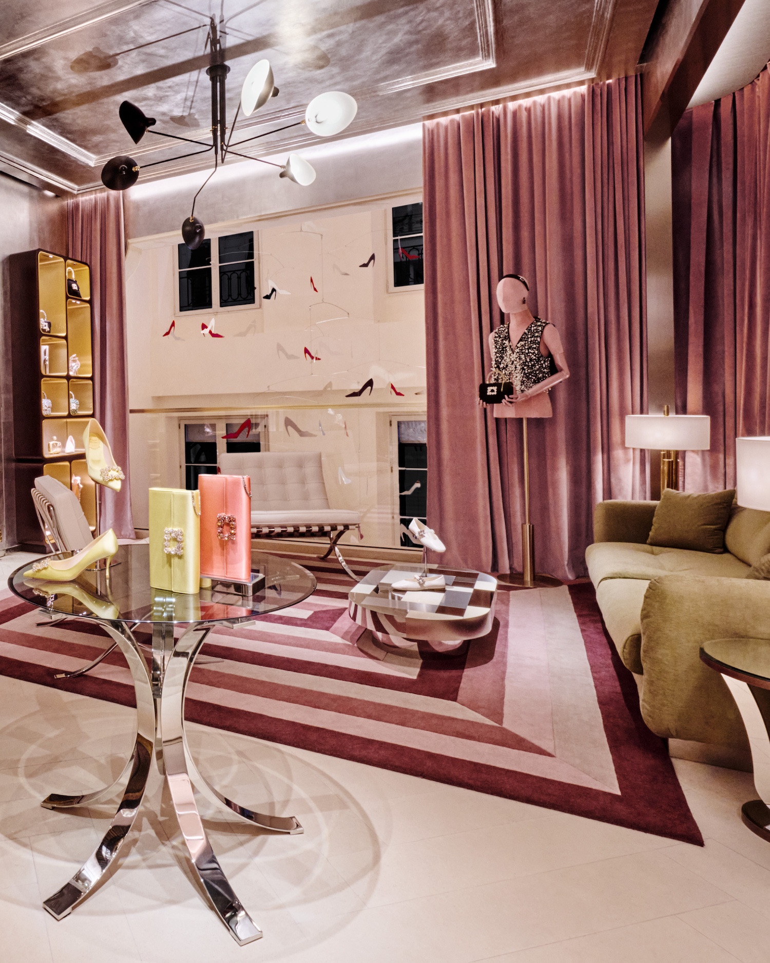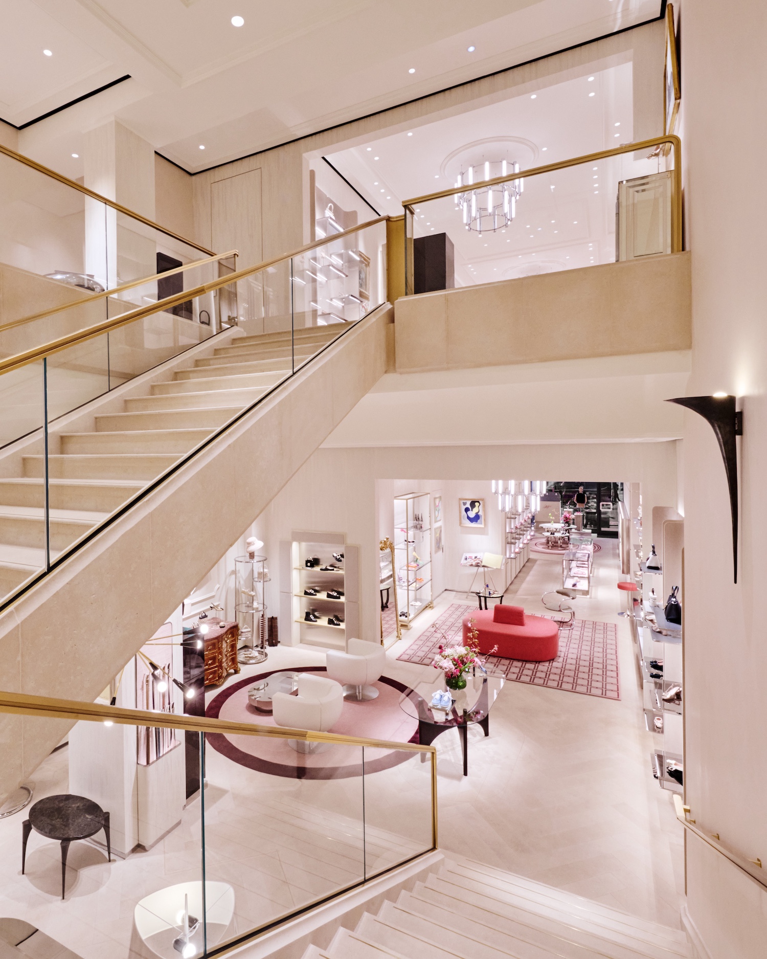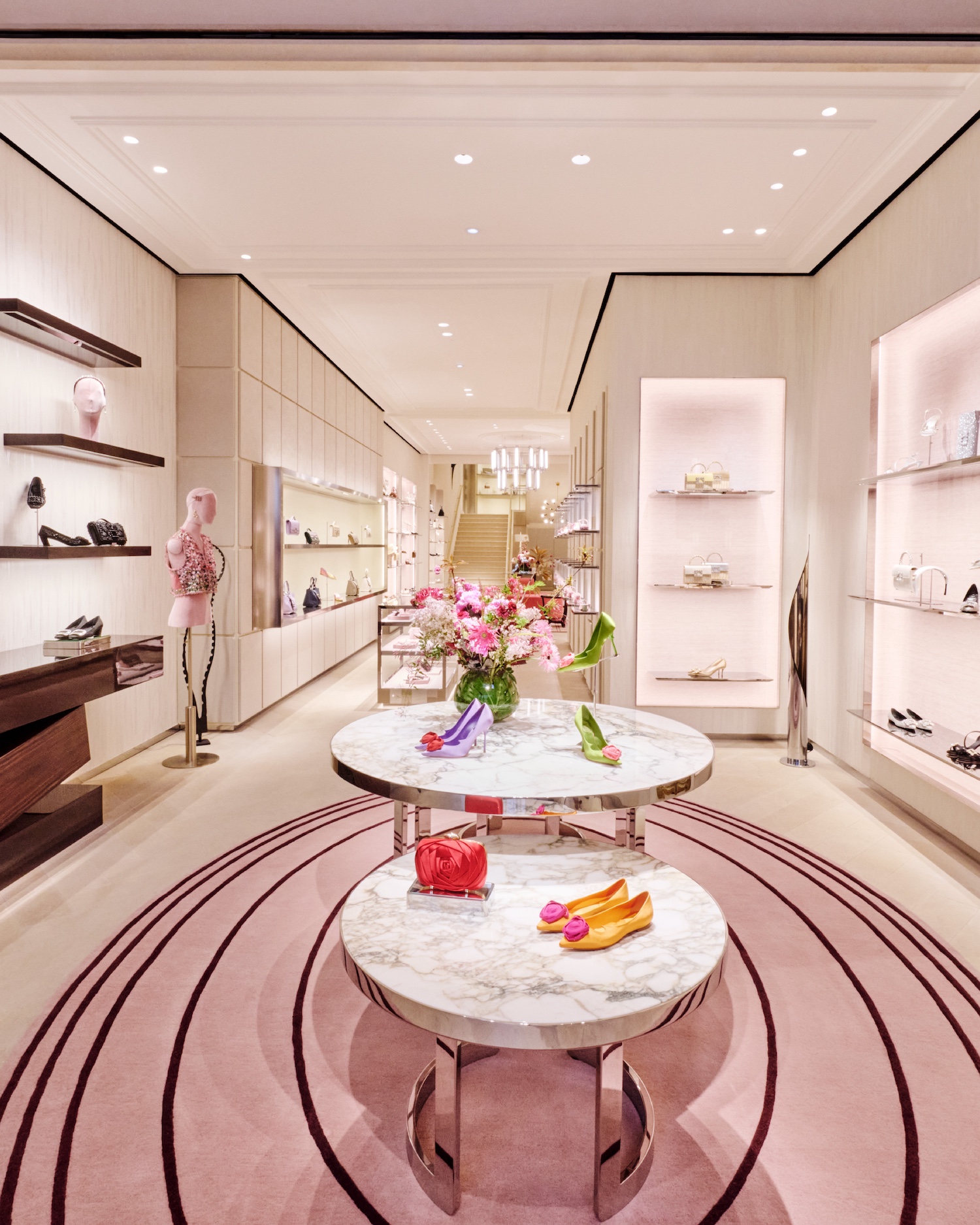 Designed as both a boutique and an extension of the brand’s visual language, the interior blends French materials with a layered mix of furniture, antiques and artworks. A dedicated Atelier Vivier space introduces made-to-order services, allowing clients to customise footwear and accessories within a more private setting.
