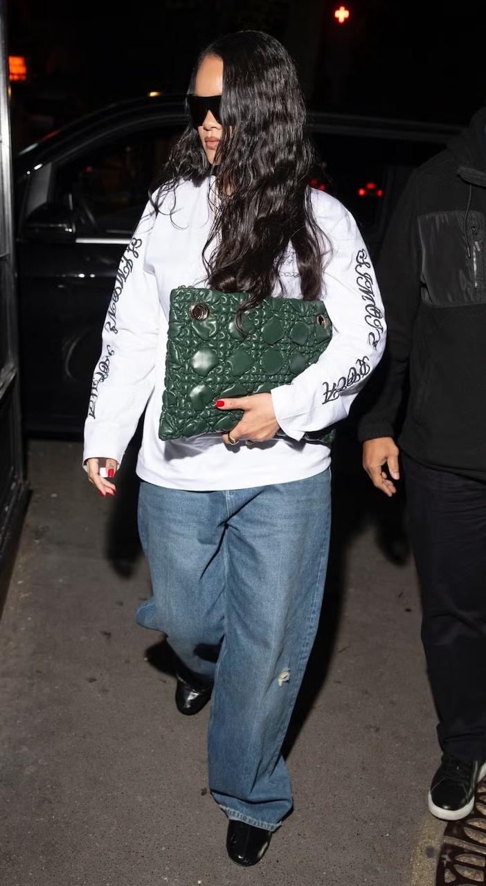 It may have been 2am, but Rihanna still made a statement with her outfit while out for a late dinner in Paris. She wore the white Pillowcase Logo Print Long Sleeve T-Shirt, featuring cursive logo detailing, from Simone Rocha’s Spring/Summer 2026 collection along with baggy denim jeans for a relaxed feel. Her forest green, Medium Crunchy Bag from Dior was worn as a clutch, adding a colourful pop to her overall look.