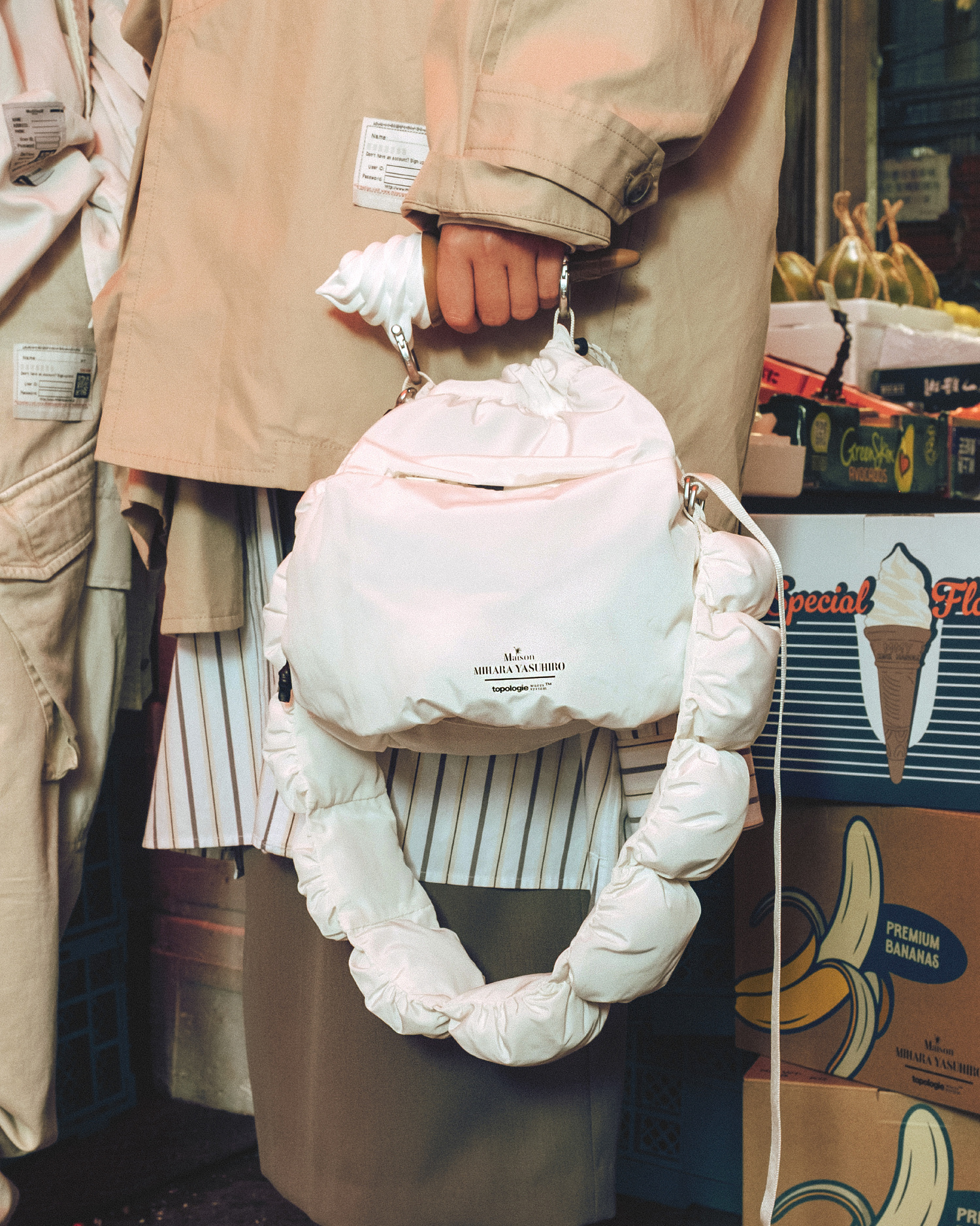 Drawing inspiration from early morning essentials (and ice cream!), Topologie x Maison MIHARA YASUHIRO takes their playful Banana, Soft Serve, and Toothpaste motifs to serve as functional embellishments in their newest accessories. The three odd items are transformed into actual handles in a unique twist. If the bags are too avant-garde for you, the three motifs also shape the Phone Strap Adapter for discreet quirkiness. Engineered with Topologie’s Wares System™, the 8mm Rope Strap complements the adapter and moves with you for comfort and versatility.