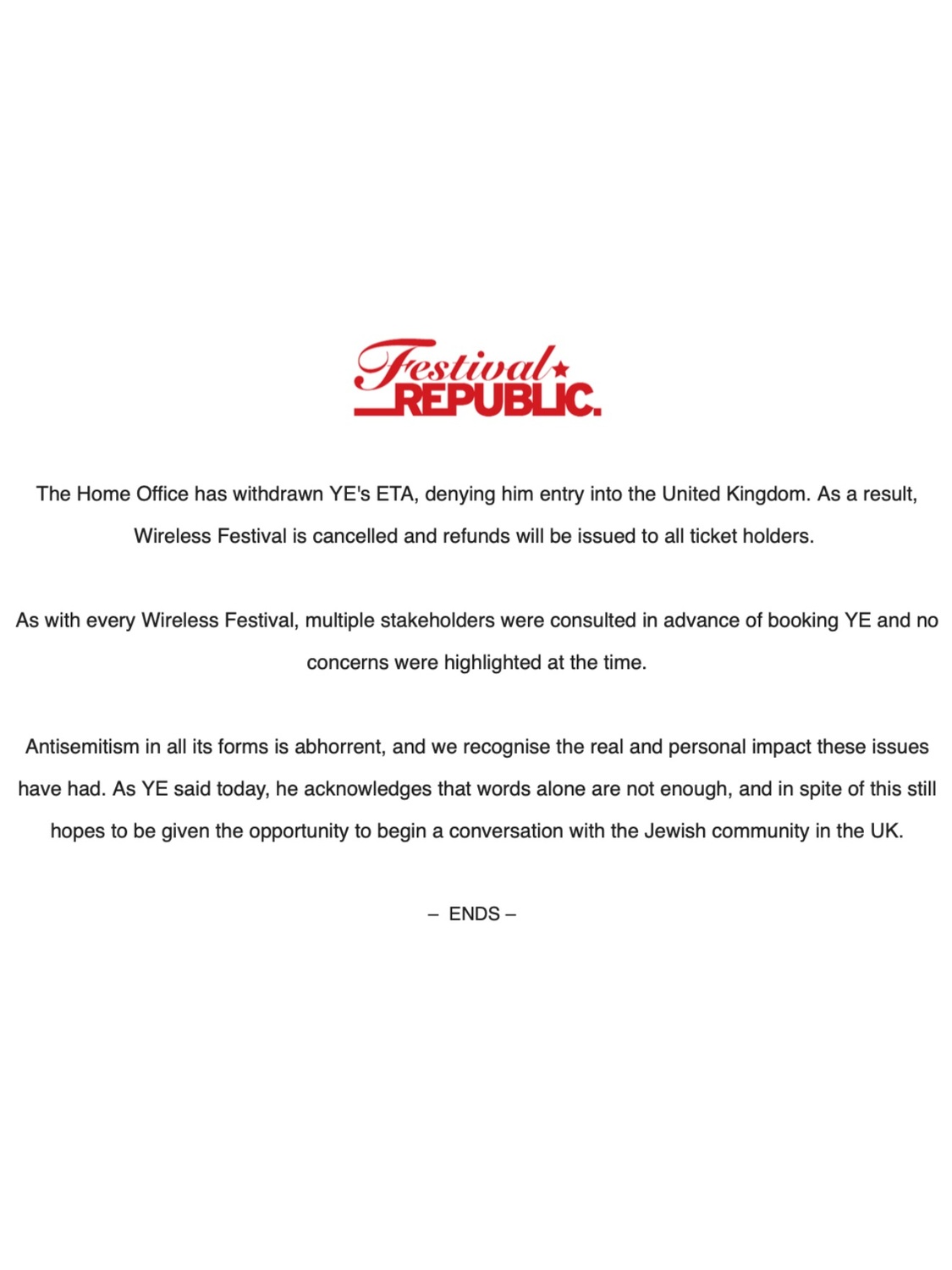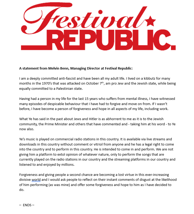 Festival Republic claimed that “no concerns were highlighted at the time” when Ye was booked and acknowledged the abhorrence of antisemitism. They have now issued a full refund to all ticket holders.