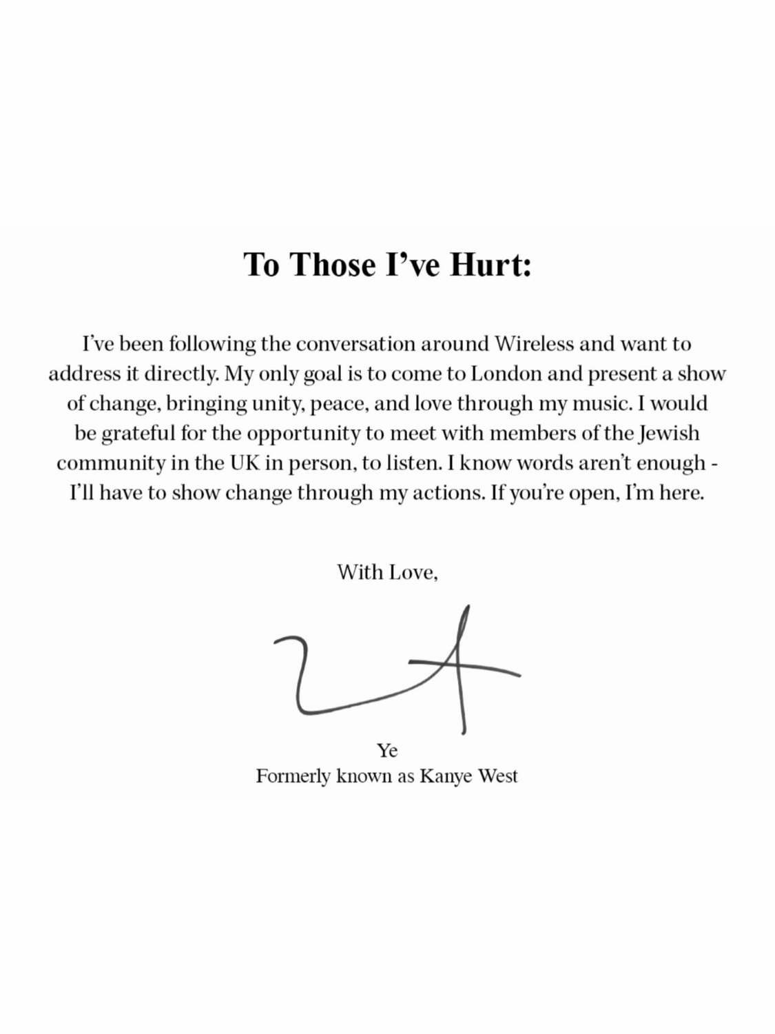 In response to initial backlash over his Wireless Festival appearance, Ye issued a statement. “I know words aren’t enough – I’ll have to show change through my actions. If you’re open. I’m here.” He also expressed that he was willing to meet with members of the British Jewish community. In January, he took out an advertisement in the Wall Street Journal apologising for his antisemitic behaviour and linked it to his bipolar disorder. He continues to discuss his mental health struggles in the public domain.